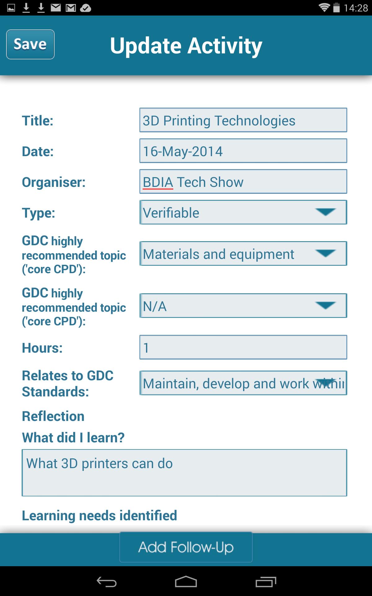Record all your professional development activities in the CPD module. Categories them into verifiable or general as well as the General Dental Council’s ‘core’ highly recommended and recommended subjects. See at a glance your yearly and five-year cycle summaries and make submitting your annual return with the General Dental Council a breeze. Reflect on what you have learnt and set follow-up activities which are entered in your calendar. See at a glance your recorded and follow-up activities.
