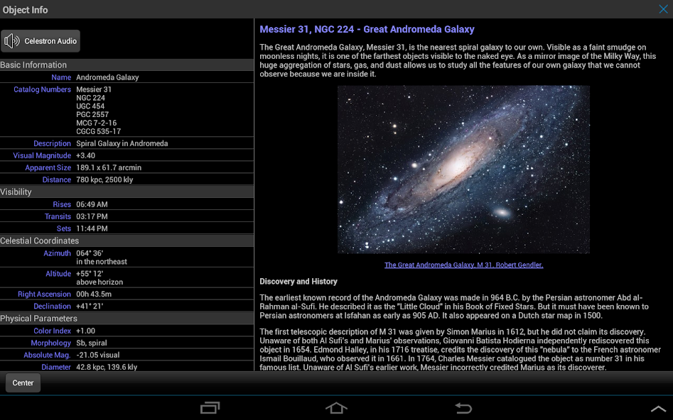 Simulate the night sky and plan your observing session with a custom list of tonight’s best objects based on your exact time and location. Look ahead to see when Jupiter’s Great Red Spot will be visible, animate transits, eclipses, and other celestial events. View hundreds of photos or listen to more than four hours of audio narration to enhance your stargazing experience.