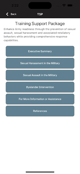 This app is to support the TRADOC Sexual Harassment/Assault Response and Prevention (SHARP) campaign plan which is designed to reduce with the goal of eliminating sexual harassment and sexual assault from our ranks. This is one of many initiatives developed to ensure that every member of our TRADOC family serves in a safe environment, free from sexual harassment and sexual assault.
