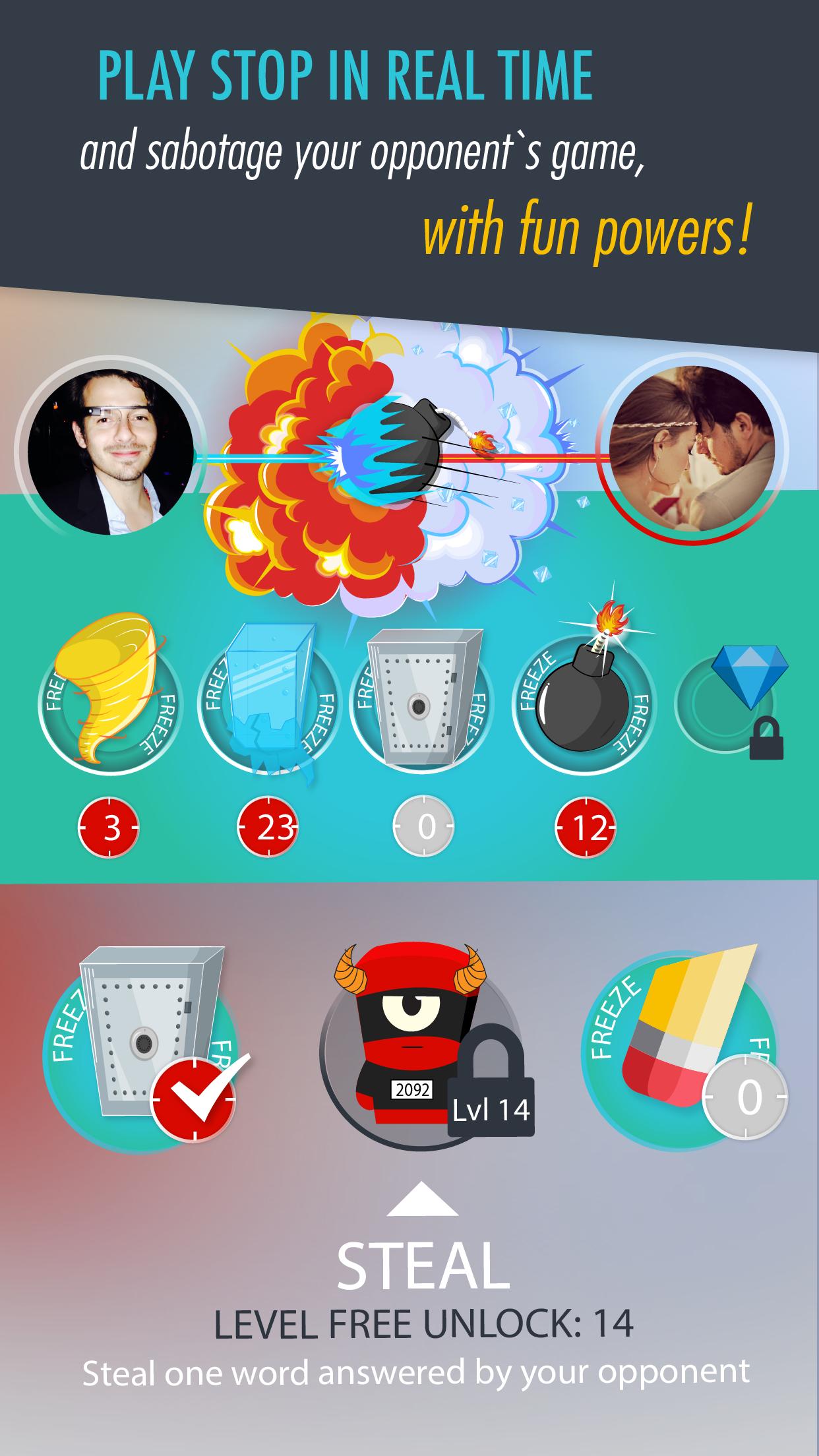 Stop Revenge Word Battle هي لعبة "إيقاف كلمة" حيث تجعل Powers Battles أكثر متعة! فقط تخيل خصمك قريبًا من الفوز وترسل قوة تجميد ... بوم !!! أنت تفوز ؛)