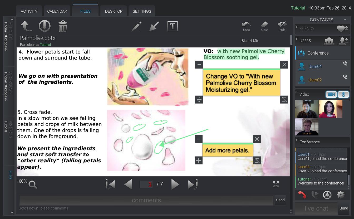 Werbeagenturen, Krankenhäuser, Architekten, Lerninstitutionen und alle, die mit digitalen Inhalten arbeiten, profitieren von der Echtzeit -Zusammenarbeit. Mit Studiopass können die Teilnehmer eine Vielzahl von Dateitypen anzeigen und zusammenarbeiten, darunter Microsoft Office -Dateien, PDF, alle beliebten Videodateien, Audio -Dateien und Branchenstandard -Bilddateien, einschließlich Dicom Medical -Bilder, mit Echtzeit -Rahmen genaue kollaborative Scrubbing, Text- und Video -Chat, Zeichnen und Text -Sticky -Notizen auf Frame- und Blogging -Kommentare. Laden Sie ein unterstütztes Dateiformat hoch und schauen Sie sich an, dass es auf dem Bildschirm angezeigt wird, um sofort angezeigt und kommentiert zu werden.