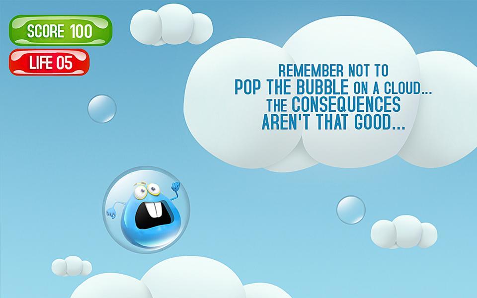 Steigen Sie in die riesige schwebende Blase ein und sammeln Sie mehr Blasen, um fortzufahren ... Denken Sie daran, die Blase nicht auf eine Wolke zu stecken ... die Konsequenzen sind nicht so gut ...