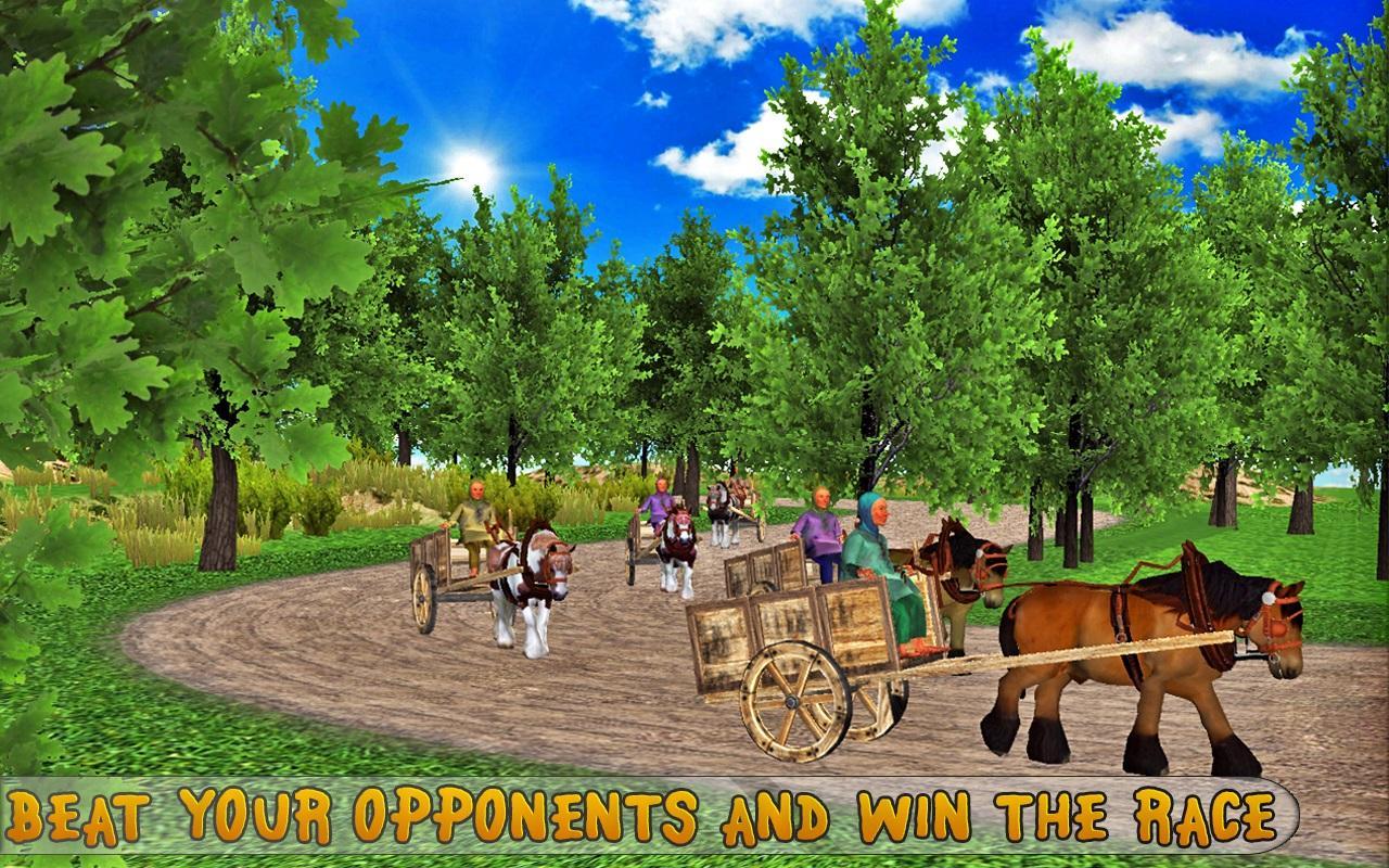 • Rennen Sie gegen andere Pferdewagen. Lassen Sie Ihre Rennkonkurrenten nicht die Ziellinie vor Ihnen erreichen.
