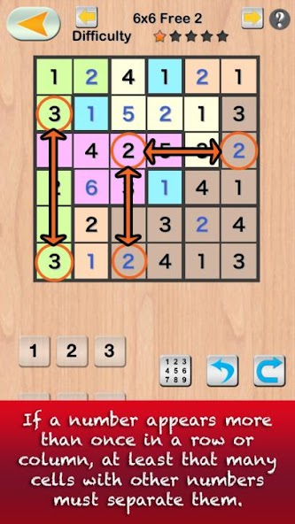 Wenn zwei identische Zahlen in derselben Zeile oder Spalte erscheinen, müssen sie mindestens so viele Zellen mit anderen Zahlen trennen. Beispielsweise sind zwei Zellen, die '1' enthalten, möglicherweise nicht orthogonal benachbart, sondern müssen mindestens eine Zelle zwischen ihnen mit einer anderen Anzahl haben. Zwei Zellen mit '3' in derselben Zeile oder Säule müssen mindestens drei Zellen mit anderen Zahlen zwischen ihnen in dieser Zeile oder Spalte und so weiter aufweisen.