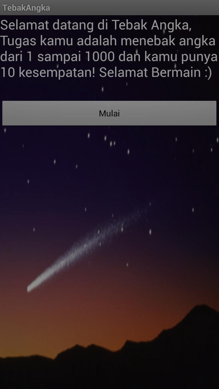 Tebak Angka , einfache Spiele der Kinder der Nation, wie die Spiele in der Vergangenheit Alfalink, raten Sie zufälligen Zahlen von 1 bis 1000, 10 Mal, wenn falsch, TAR wird zum Beispiel zuerst 1-1000, wenn wir 500 erraten, und die Zahl 234, es wird zwischen 1-500 usw. liegen usw. ...