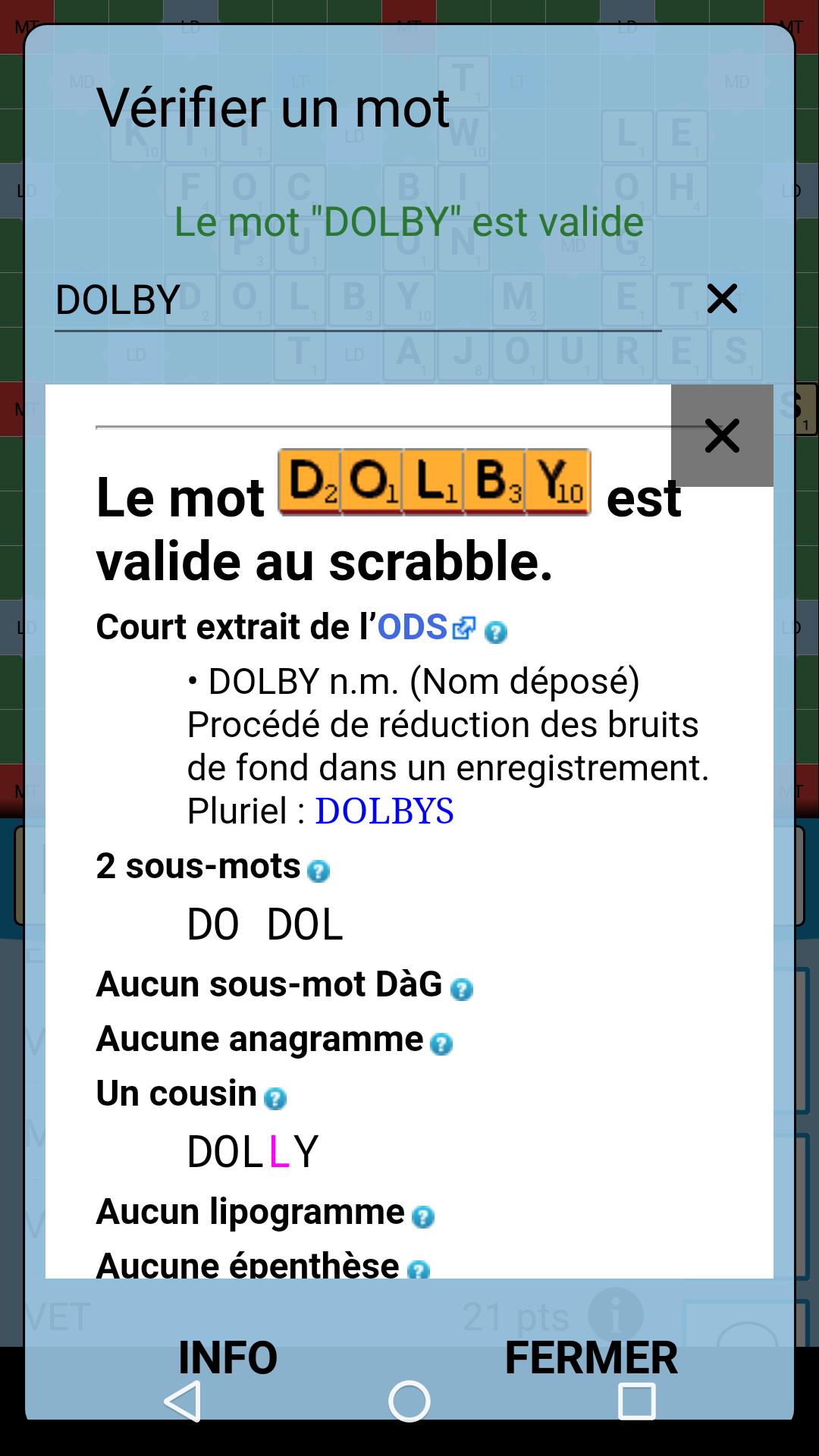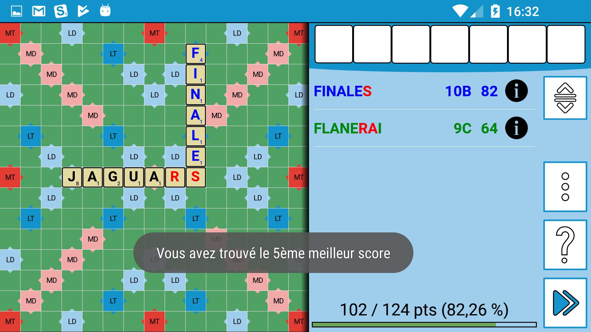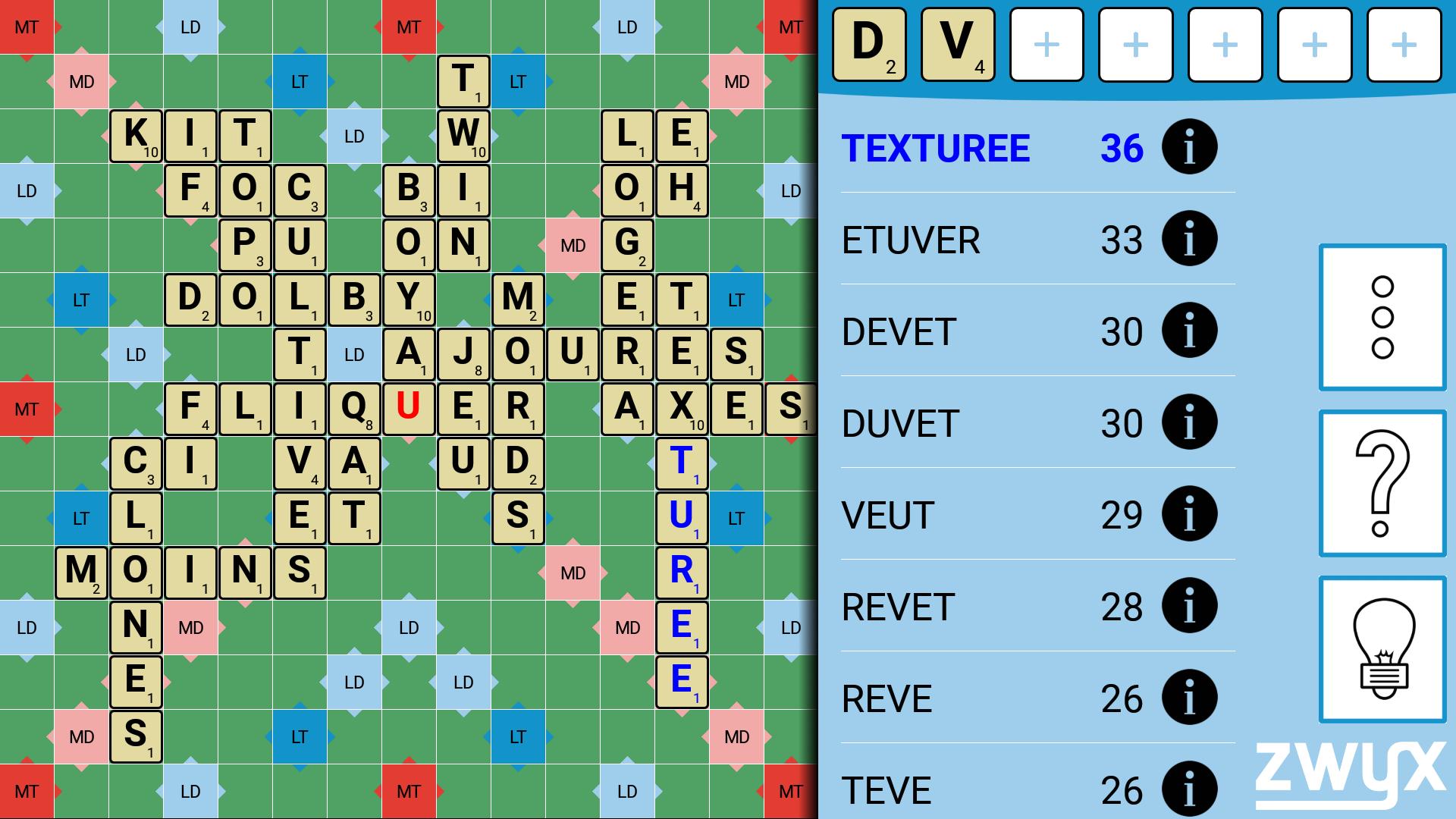 Spielen Sie ein Spiel mit Familie, Freunden, im Internet oder möchten nur einen Teil dessen, den Sie die Drucke kennen, wiederholen? Zwyx dient als Assistent: Geben Sie die Briefe ein, die Sie in Ihrem Besitz haben, platzieren Sie die Wörter, die bereits bei Bedarf gespielt wurden, und validieren Sie dann. Die Liste aller möglichen Lösungen wird in einem Bruchteil einer Sekunde angezeigt, die in der Reihenfolge von Punkten sortiert sind. Darüber hinaus können Sie die Definition eines jeden Wortes konsultieren.