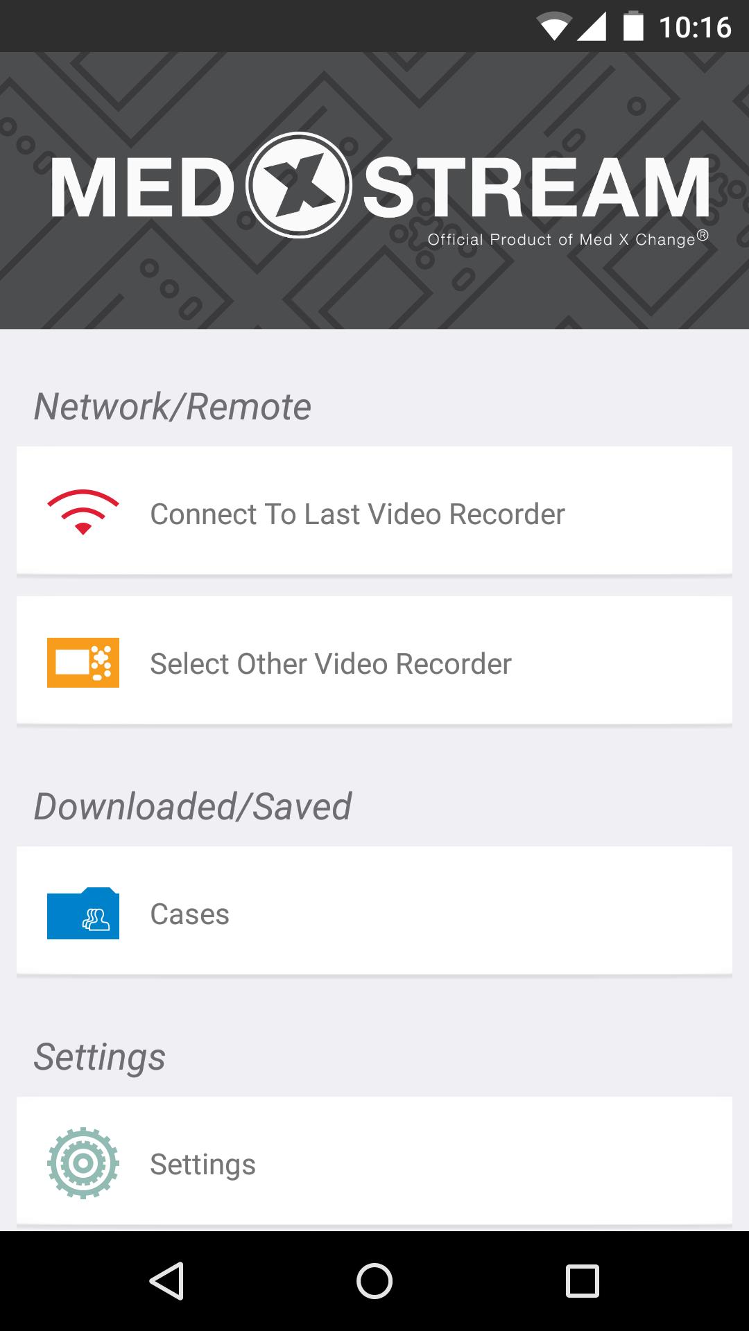La nueva aplicación Android Med X Change® MedXStream ™ ofrece la capacidad de emparejarse con nuestra grabadora EvolutionHD y DRSHD 1080p. Esto se puede hacer en el caso o durante el caso. Instale nuestra aplicación MedXStream ™ en su dispositivo Android, conéctese de forma segura e inalámbrica a su EvolutionHD o DRSHD 1080p y acceda instantáneamente a sus casos quirúrgicos para revisar, reproducir, descargar e incluso control remoto.