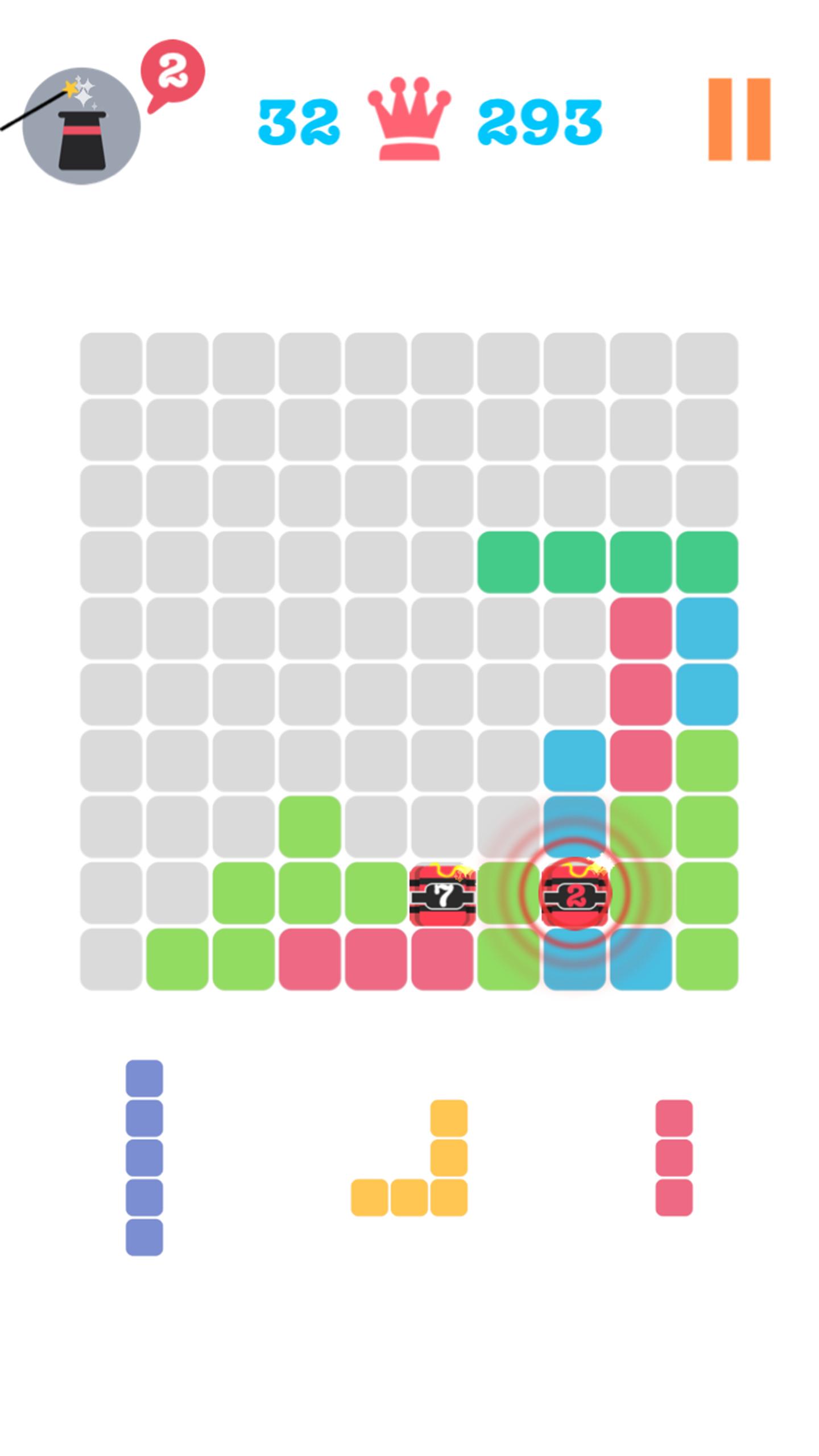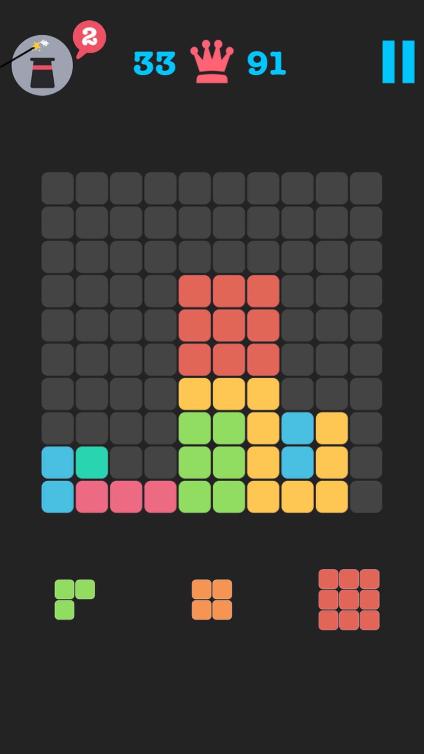 ¡No hay límite de tiempo para el juego, cuando te cansas de jugar, puedes pausar el juego y luego continuar más tarde donde te fuiste! Llene todas las cuadrículas con los bloques a juego y disfrute del juego de bloques 10x10.