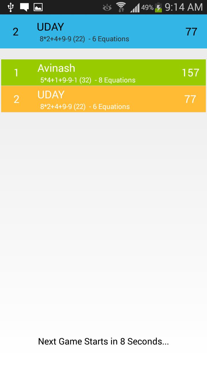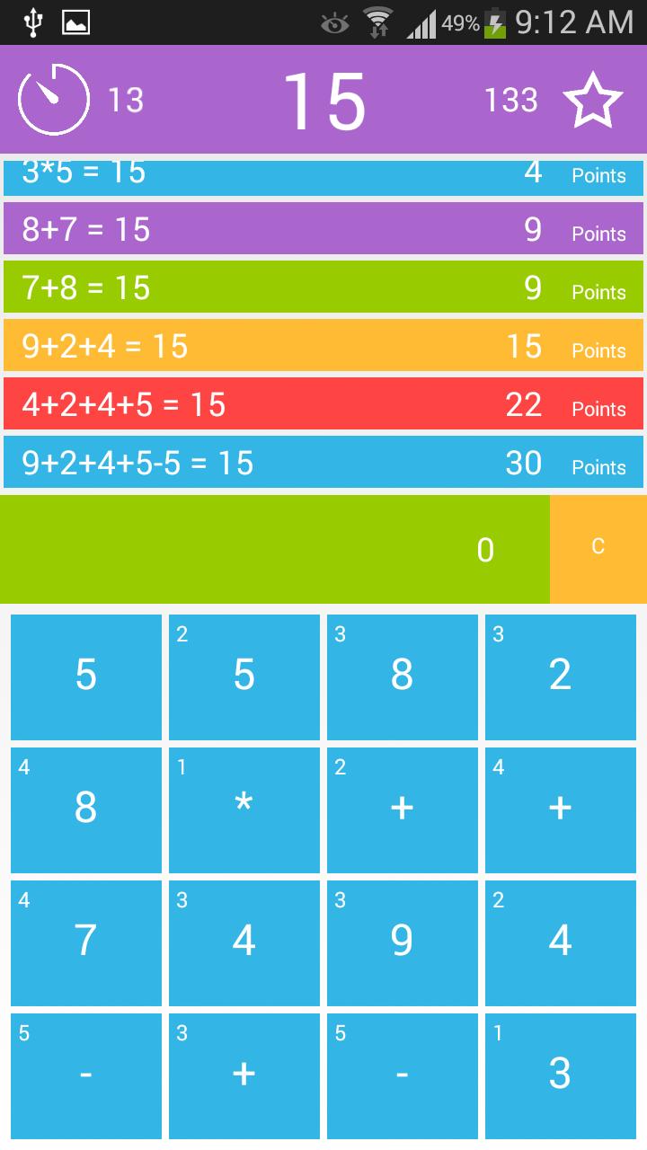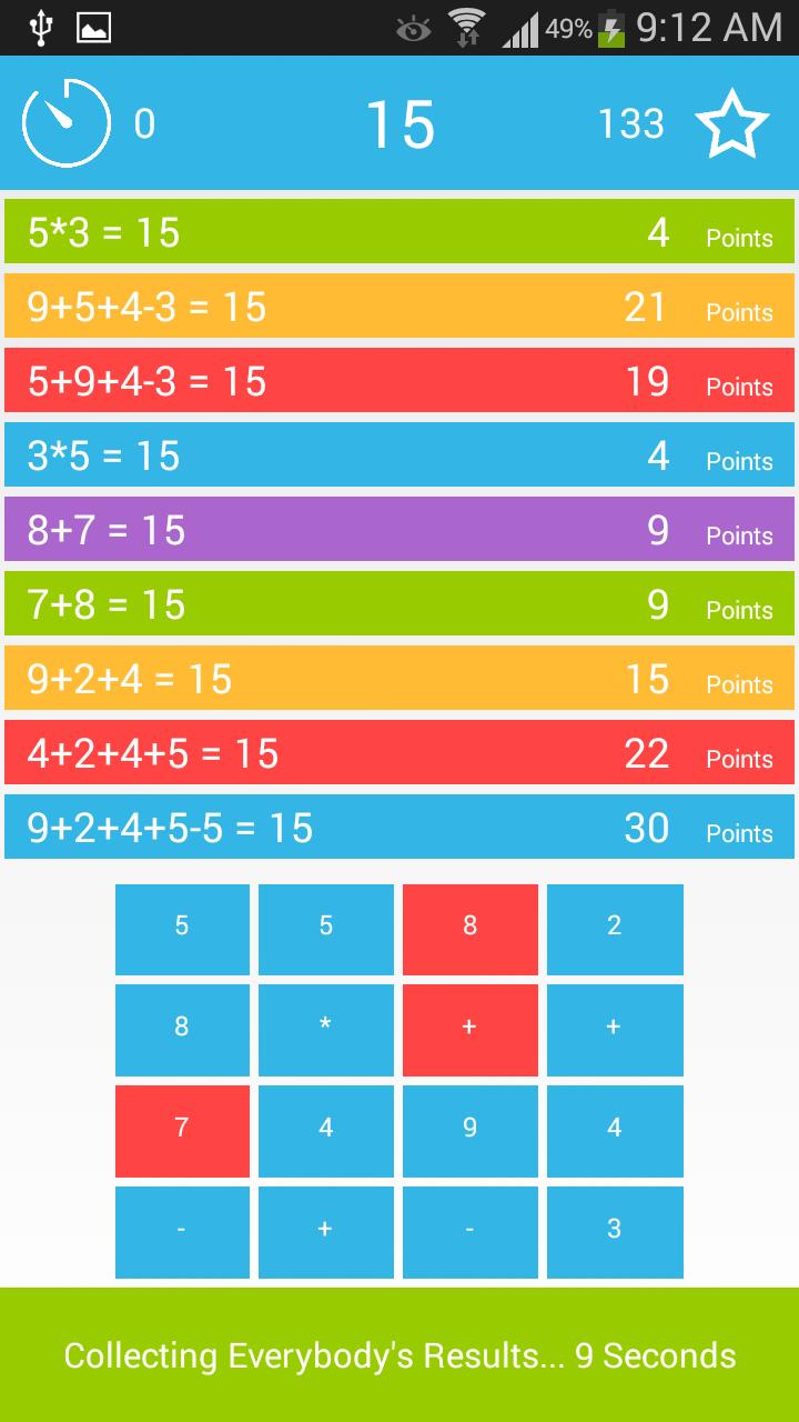 Dada la Junta de Número y Operadores 4x4, el objeto es encontrar tantas ecuaciones como pueda en tiempo limitado seleccionando números. Al final de cada ronda, se muestra su rango contra otros jugadores.