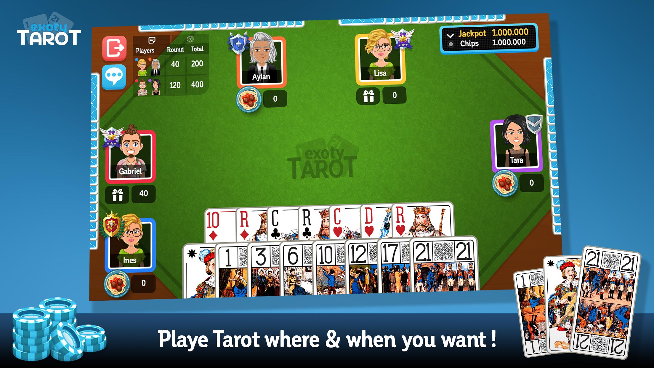 Puedes jugar Tarot con 3,4 o 5 jugadores que el juego respeta las reglas reales del principiante FFT o confirmó que enfrentarás a los jugadores de tu nivel de acuerdo con las disponibilidades, en cuyo caso, enfrentarás a un jugador aproximadamente de tu nivel. De acuerdo con la ley francesa de los juegos de cartas, la distribución de cartas es 100% aleatoria para todos los juegos y para todos los jugadores y esto nunca cambiará. ¿Gracias por jugar Exoty Tarot ?