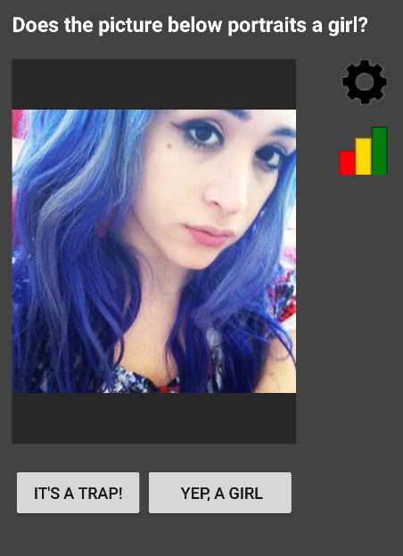 Esta aplicación está diseñada para su entretenimiento, pero sobre todo porque queremos ver un "¿Estás de verdad" en tu cara? Ves una foto de una persona y tienes que adivinar si es de hecho una niña o una trampa (un chico que parece una niña).