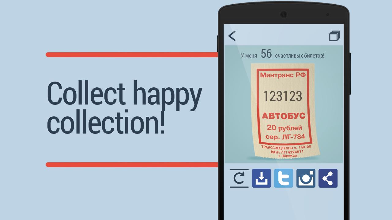 Para aquellos que saben, una famosa diversión rusa fuera de la vida, comprar un boleto en el autobús o tren y encontrar los números en el boleto. Este no es un examen o los boletos de examen SDA: es su suerte y suerte. Imagine ese boleto de tren, aire o bingo. ¿La cantidad de los primeros y los últimos 3 números es igual? ¡Entonces estás feliz! El precio de este boleto hace que no comprarlo. El apéndice "Ticket Lucky" brinda la oportunidad de gratis y experimenta la suerte en cualquier año, 2015, 2016 y siempre. Verifique el ticket puede ser usted mismo, y la solicitud en sí puede sugerir. No es el conocimiento necesario de las matemáticas, la geometría y otras materias de la escuela o la universidad.
