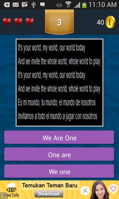 Tebak Lagu Terbaru es el juego adivinando las Tebak Lagu Terbaru canciones. En este juego, proporcionarás una imagen de una pieza de letras de canciones y luego te das 3 opciones para responder.