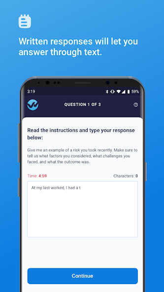 Après avoir téléchargé l'application et interviewer, vous aurez une chance de lire les instructions et de tester votre caméra vidéo. Une fois que vous avez commencé votre interview, vous pouvez regarder des vidéos de votre intervieweur à parler et à poser des questions. Pour chaque question, vous aurez un peu de temps pour réfléchir avant d'enregistrer votre réponse vidéo. Ce processus se répétera jusqu'à ce que vous ayez répondu à toutes vos questions d'entrevue.