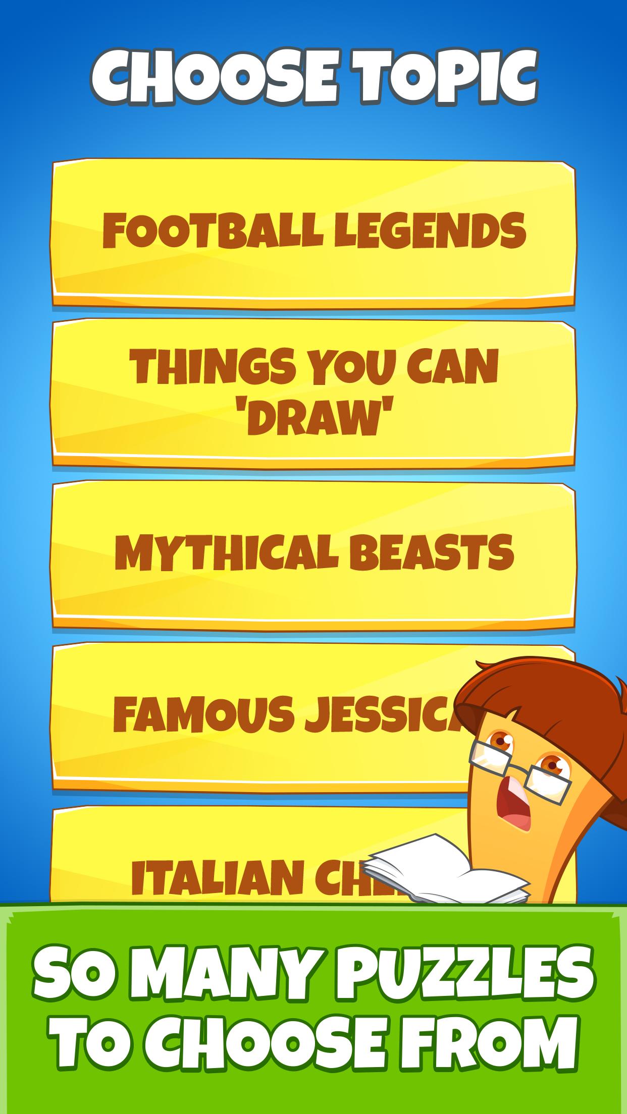 Choisissez parmi une vaste sélection de puzzles de mots différents couvrant un certain nombre de catégories: animaux et nature, divertissement, nourriture et boisson, géographie, science et technologie, société, sport et jeu de mots.