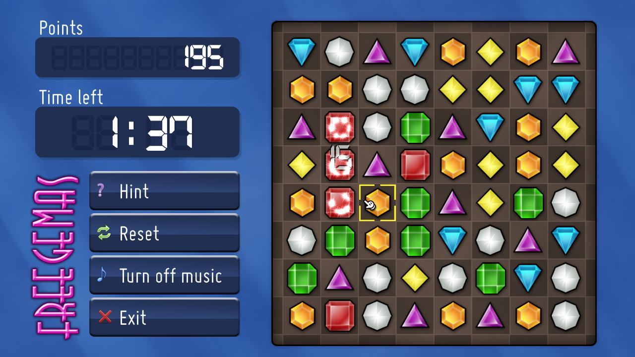 Freegemas est un jeu de réflexion gratuit dans lequel le joueur doit aligner des groupes de trois gemmes adjacentes ou plus en en échangeant deux à la fois.