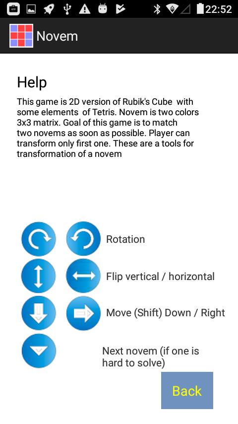 Un Novem est une matrice 3x3 de deux couleurs. Dans ce jeu, le joueur obtiendra deux Novem , et un but de ce match est de correspondre à deux Novem dès que possible. Le joueur ne peut se transformer que le premier pour correspondre à l'autre.
