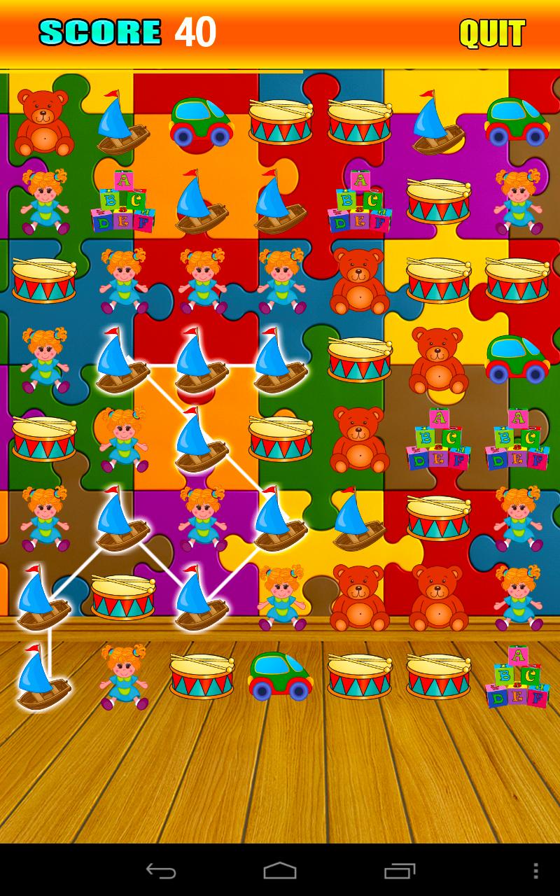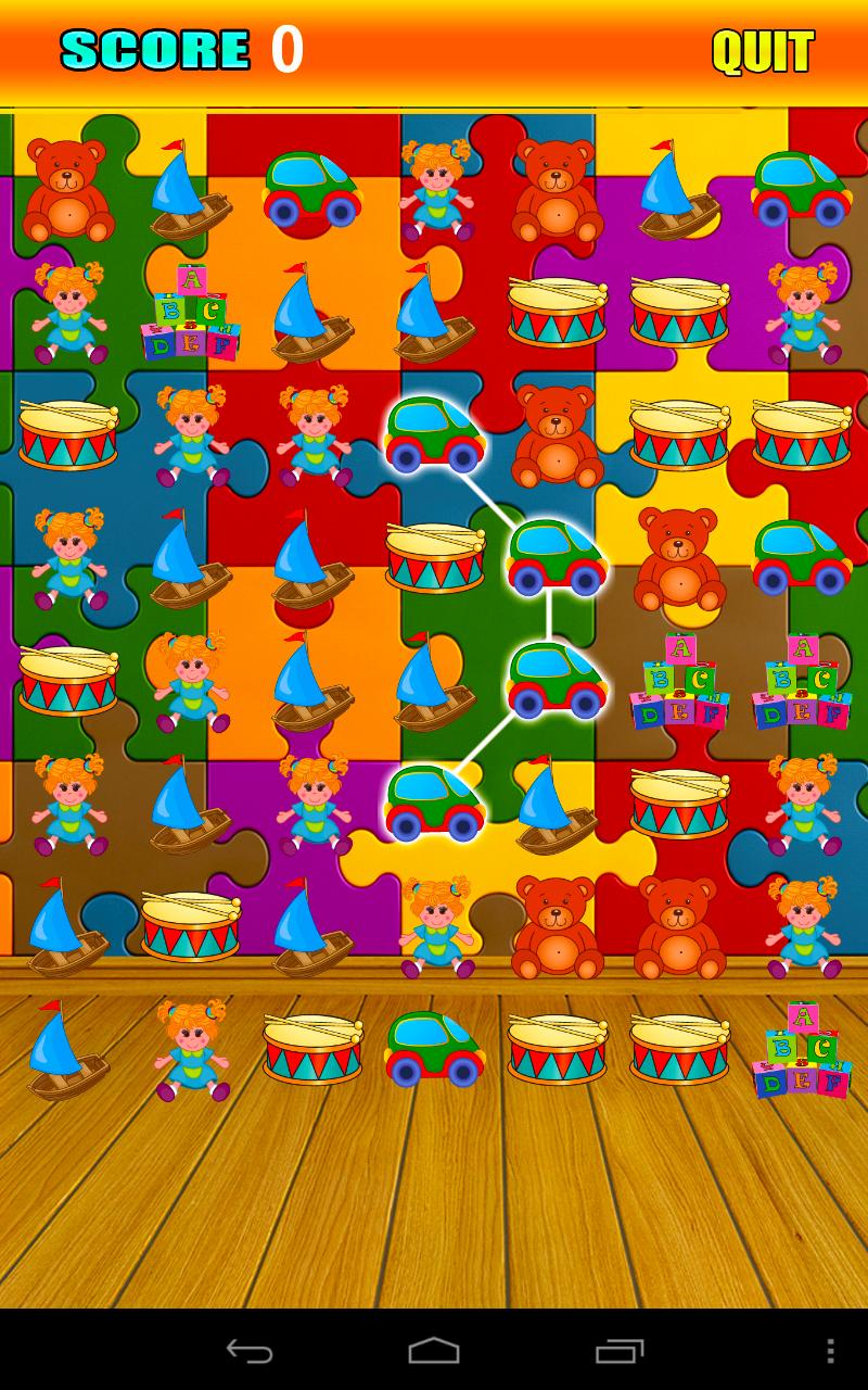 * Associez et élaborez vos propres objectifs pour dépasser votre meilleur score! Connectez-vous rapidement et facile et tracez une ligne au-dessus de la conception de jouets superbe colorée contenant des poupées heureuses, des voiliers de jouets classiques, des voitures de jouets mignonnes, de beaux ours en peluche, des blocs éducatifs avec des lettres d'ABC et un minuscule tambour de caisse claire.