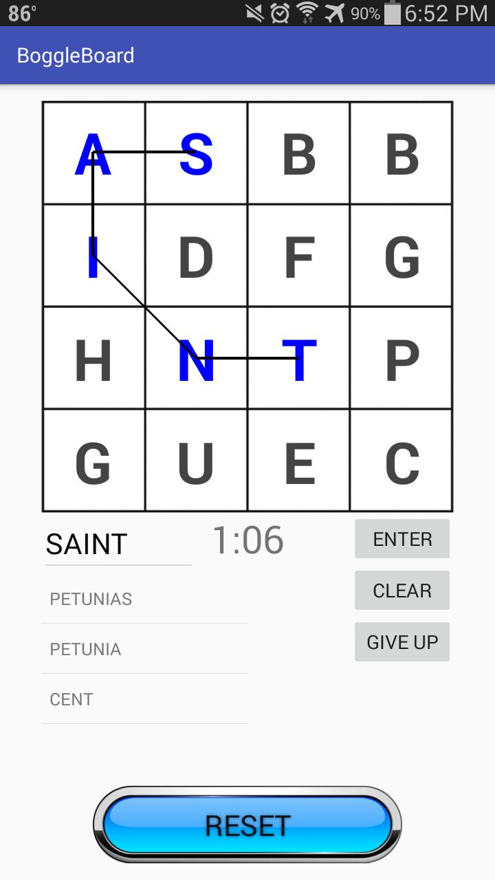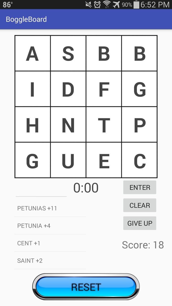 A classic Boggle board with timer and word checker