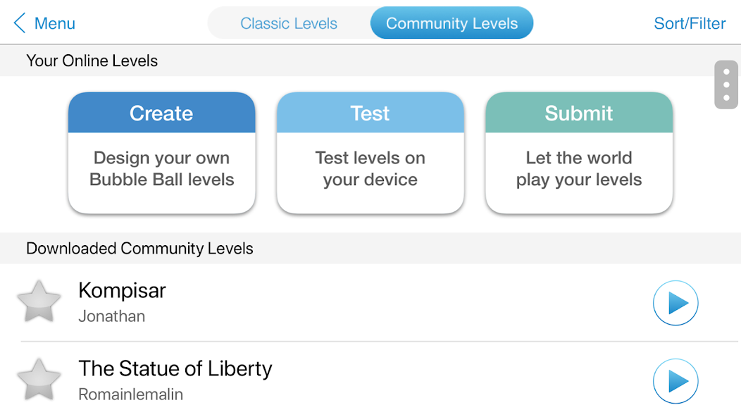 Community Levels – create your own levels for Bubble Ball, and play levels created by others! Visit naygames.com/create on your computer to start making your own levels!