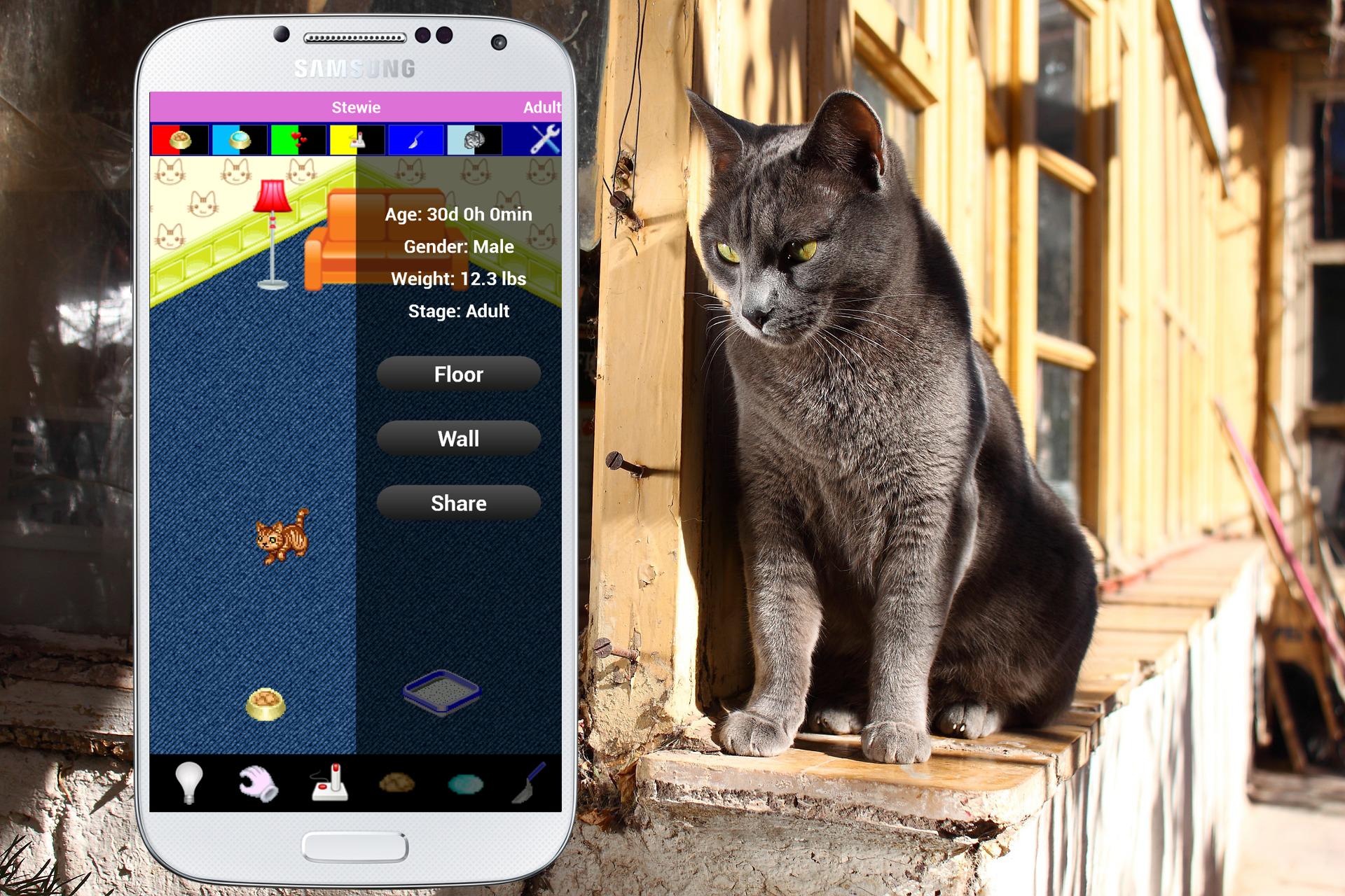 You can feed your cat, clean and love it and you can even play with your virtual pet.