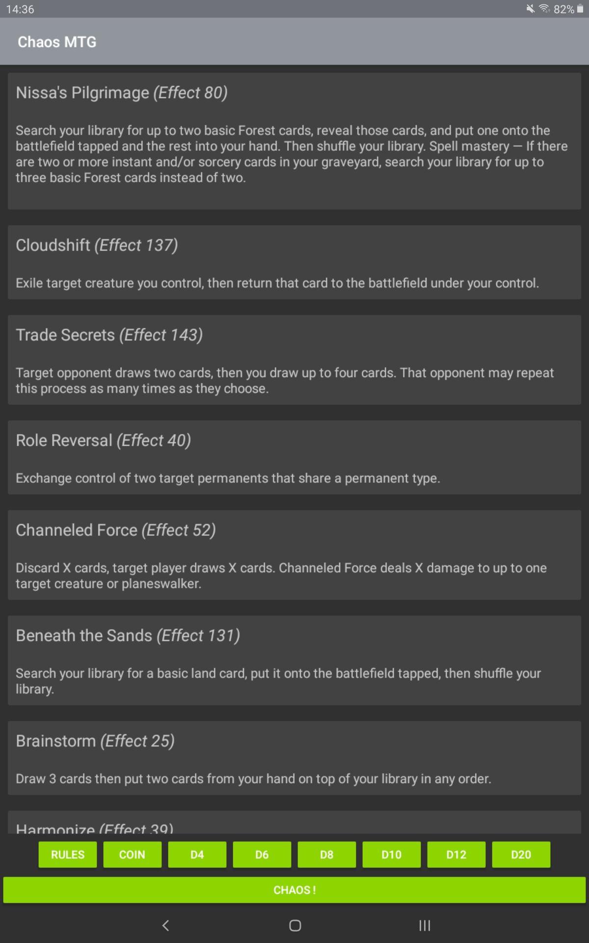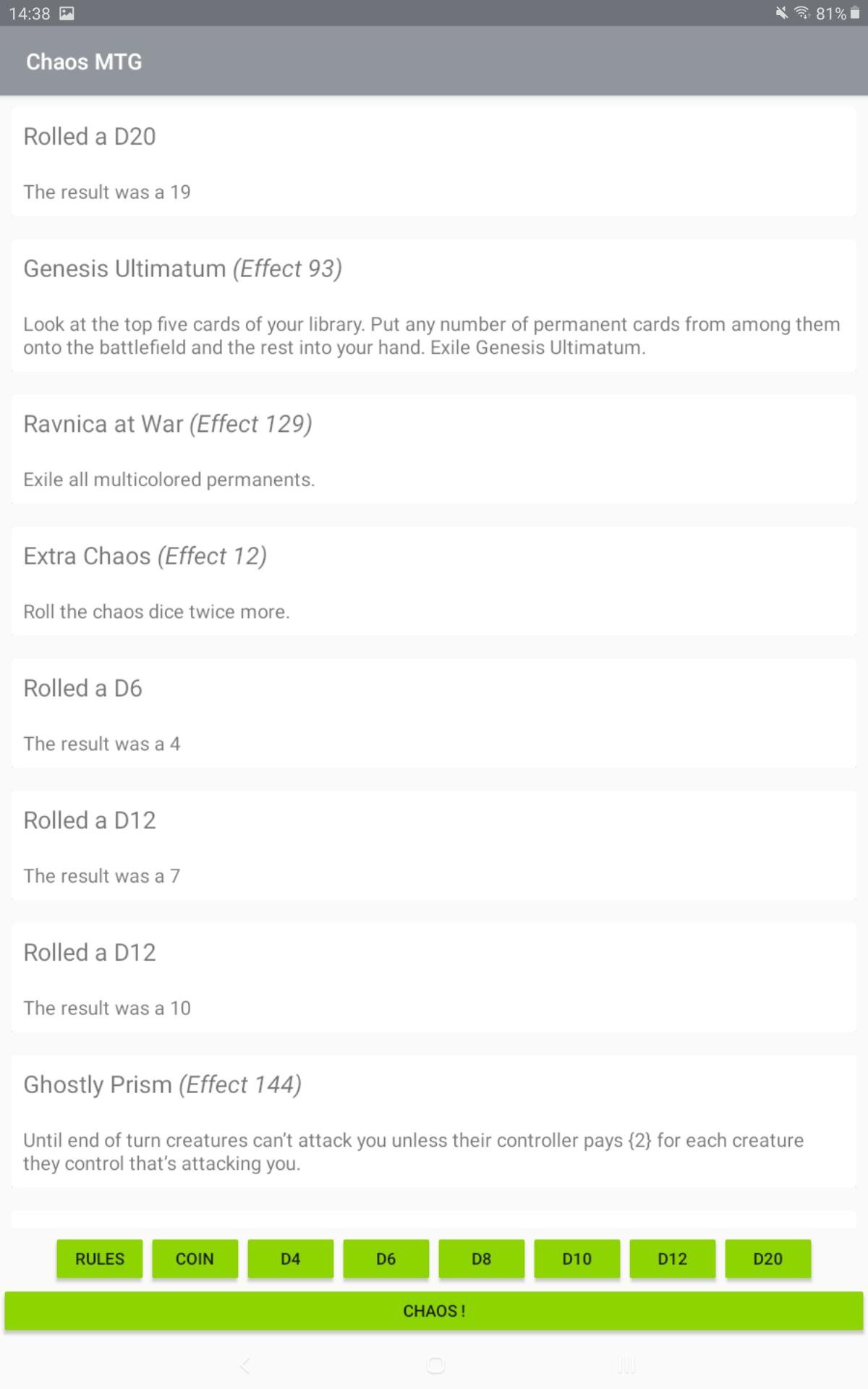 The app comes with a fun multiplayer experience. Th is app has 147 unique effects and the ability to roll dice (D4, D6, D8, D10, D12 and D20). Several of the effects have multiplayer formats, such as commander, in mind and involve multiple players.