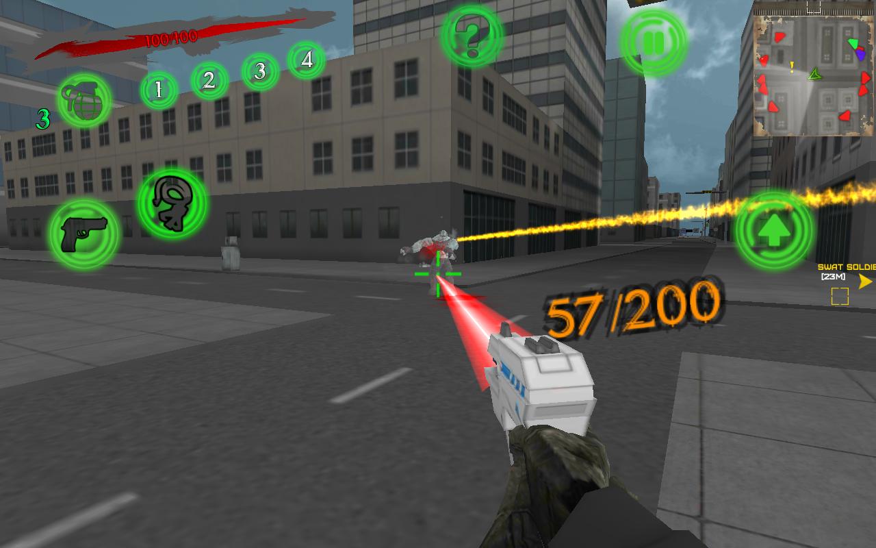 It's invasion! City captured by robots and aliens. But hero have a gun and he may bring those bastards down on their place. Snowgun have a little price but good damage. Aim monsters heads and get more money. Ten murders and bosses come. You may buy powerful AK-47 or M16, deadly sniper automatic rifle or even sci-fi guns. And what is more, you have a rope! Super hero is not a harmless baby. Stop the military entrance. Clear this town from alien creatures, slay all your enemies!