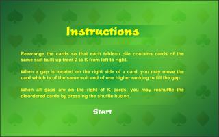 Fill in the blanks and arrange your deck! Your task in this game is to rearrange the cards so that each tableau pile contains cards of the same suit from 2 to K from left to right. When the game starts, 52 standard playing cards will be evenly distributed onto 4 tableau piles. Then the 4 aces will be removed and 4 gaps will appear. When a gap is located on the right side of a card, you can click and drag the immediately higher ranking card of the same suit to fill the gap, for example, when a gap is on the right of the 2 of spades, you can move the 3 of spades to occupy the empty position. The leftmost gap on a tableau pile is to be filled by a 2. If all gaps are on the right of K cards, then no cards can be moved to the empty spaces. In this case, you can press the Shuffle button at the top of the screen so that the cards not yet in order can be reshuffled. You will start the game with 60000 points, but each step you take will result in a deduction of 100 points and a reshuffle will cost you 10000 points, so make wise decisions to achieve your goal!