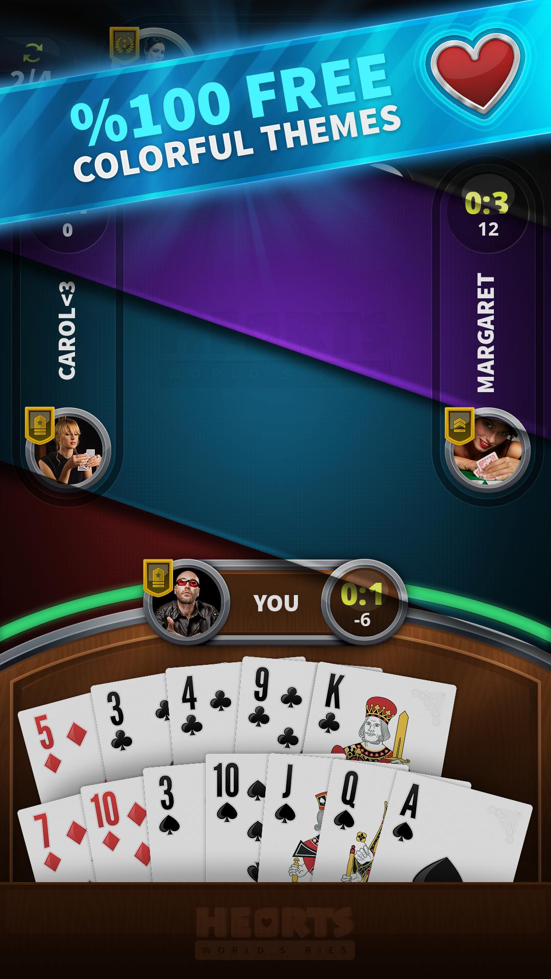 Hearts is a quick and enjoyable card game based on counting cards and luck like spades. Users can enjoy playing different game modes through highly unique AI. In this card game you will have more competitive. Users can reach new ranks, achievements while they are unlocking colorful backgrounds with entertaining game experience. The game graphics have been designed realistic for motivating users to play more realistic game experience. We would be glad to see you as a part of this card game experience!