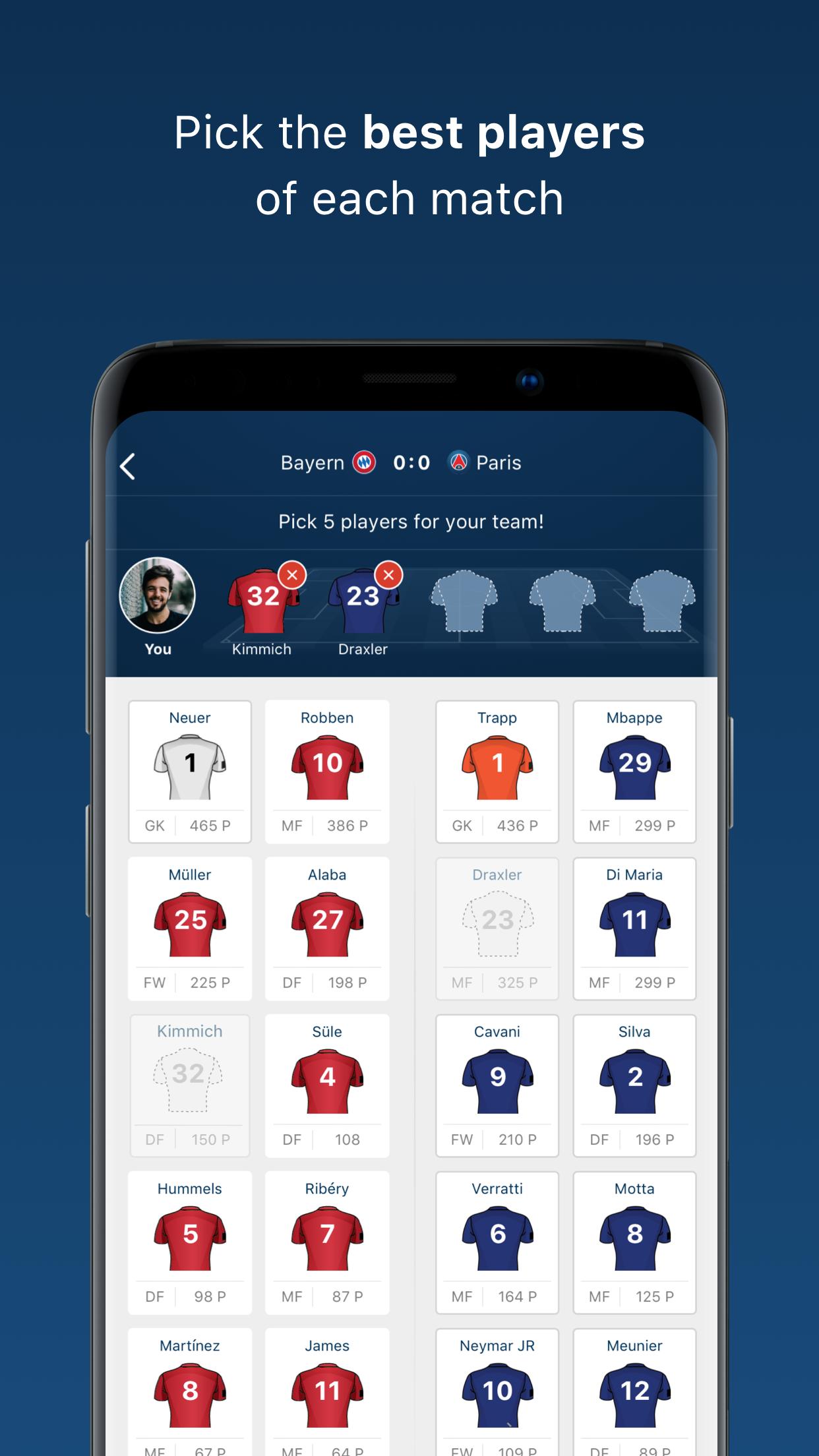 All you need to do is pick the five best performing players of a match to rack up as many points as possible. Your players' real performance throughout the match determines your score and you can follow it live, play by play, minute by minute, with our Live Ticker - don't miss out on any action!