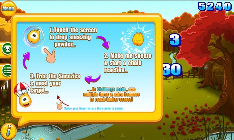Touch the screen to drop a burst of sneezing powder into the field of floating Sneezies and watch as they sneeze themselves out of their bubbles. Try to initiate a chain reaction to rescue as many Sneezies as you can in this family fun puzzle game.