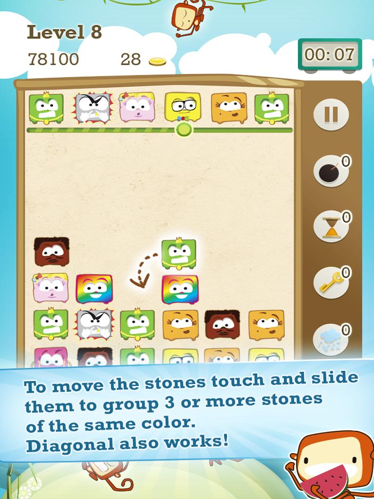 A new challenge arrives to your screen: Stontrix! It’s a simple puzzle game but full of different features and lots of surprises along the way. Prevent having your screen filled with stones by sliding them with a finger and aligning them with others of the same color which will make them disappear. Find some help along the way such as stones with a clock giving you more time, or stones with a bomb that destroy lines around them, and pay attention to make sure you align the stones with coins to collect coins and continue playing. But do not lose your guard because Stontrix stones can also be against you and make you lose the game. Be especially careful to not line up the stones with a skull!