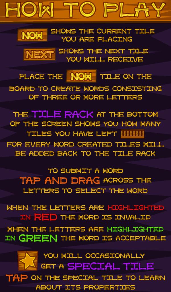 ► CREATE WORDS by placing letter tiles on the board. Each letter you place removes one tile from your rack, but submitting words by dragging your finger across them earns you more tiles back. Longer words are worth more bonus tiles!