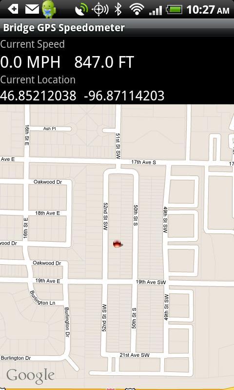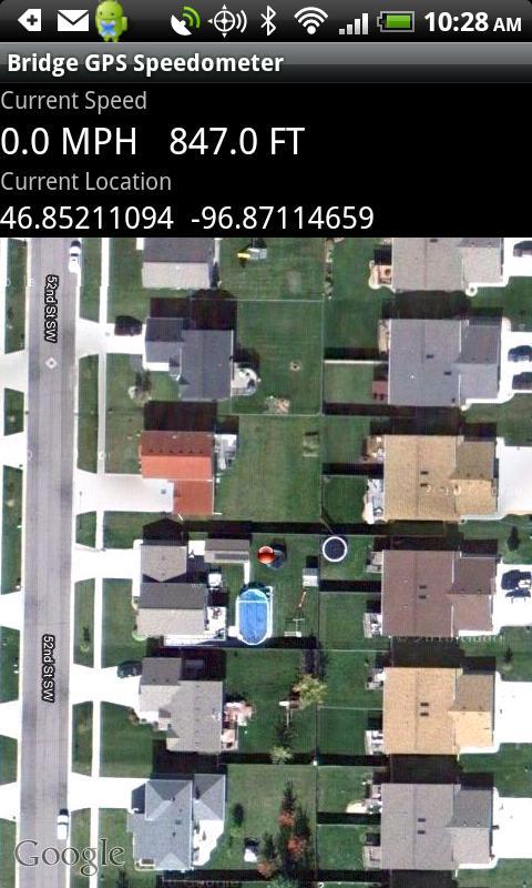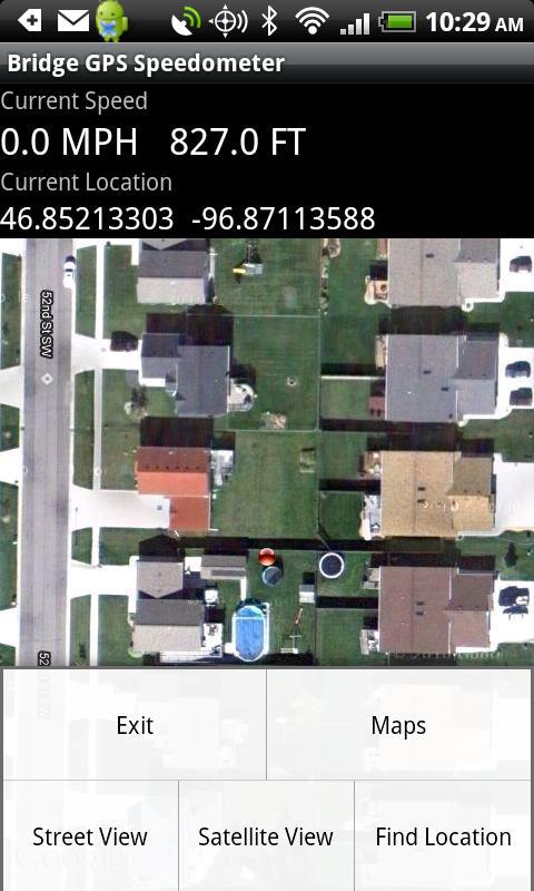 Aplikasi sederhana yang menunjukkan kecepatan Anda saat ini (mph), ketinggian (kaki), koordinat GPS, dan posisi Anda di peta jalan atau satelit. Opsi menu memungkinkan Anda untuk manis antara tampilan jalanan dan satelit, atau menemukan alamat yang secara otomatis membuka Google Maps, dan Google Navigation opsional untuk arah.