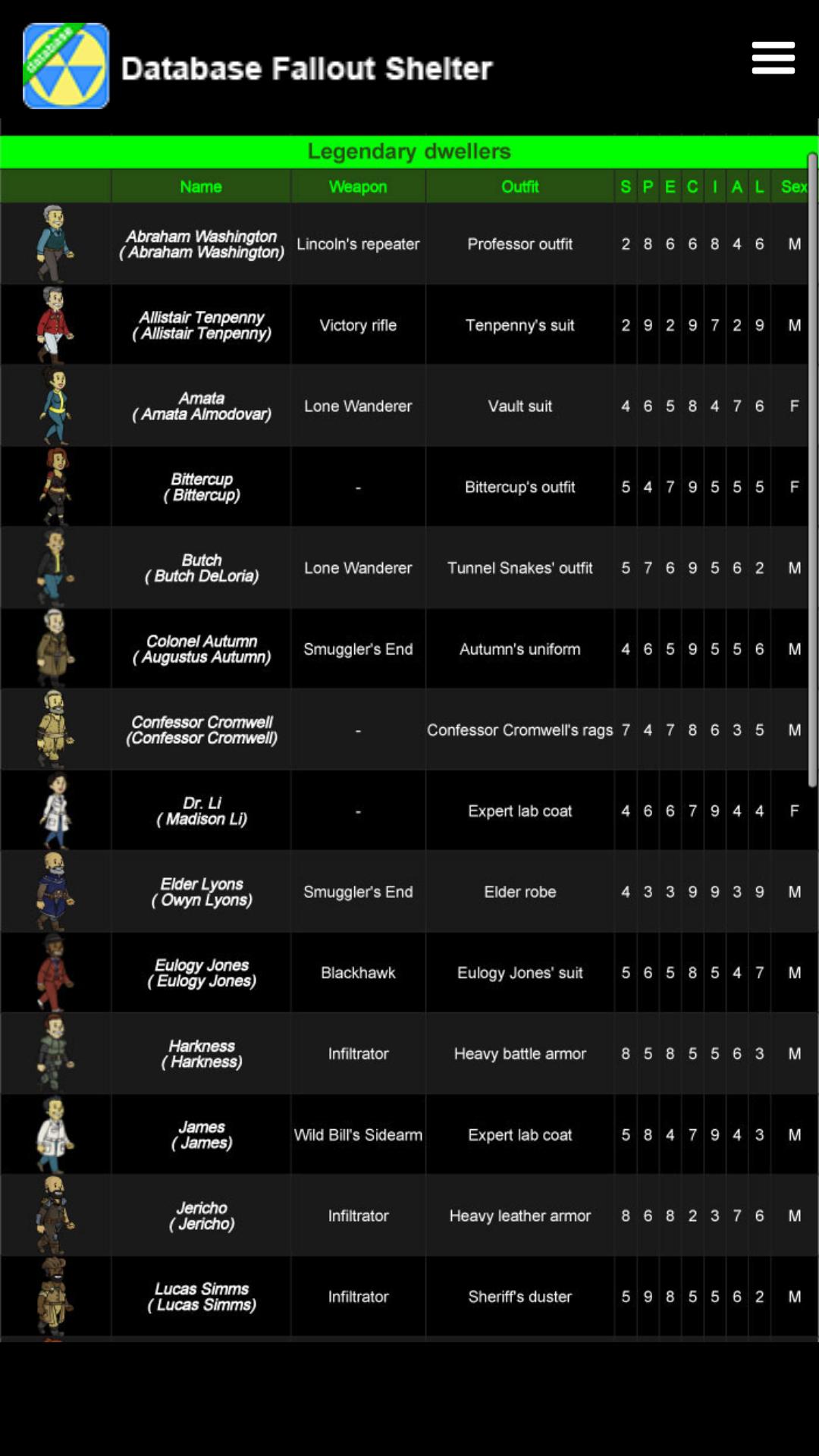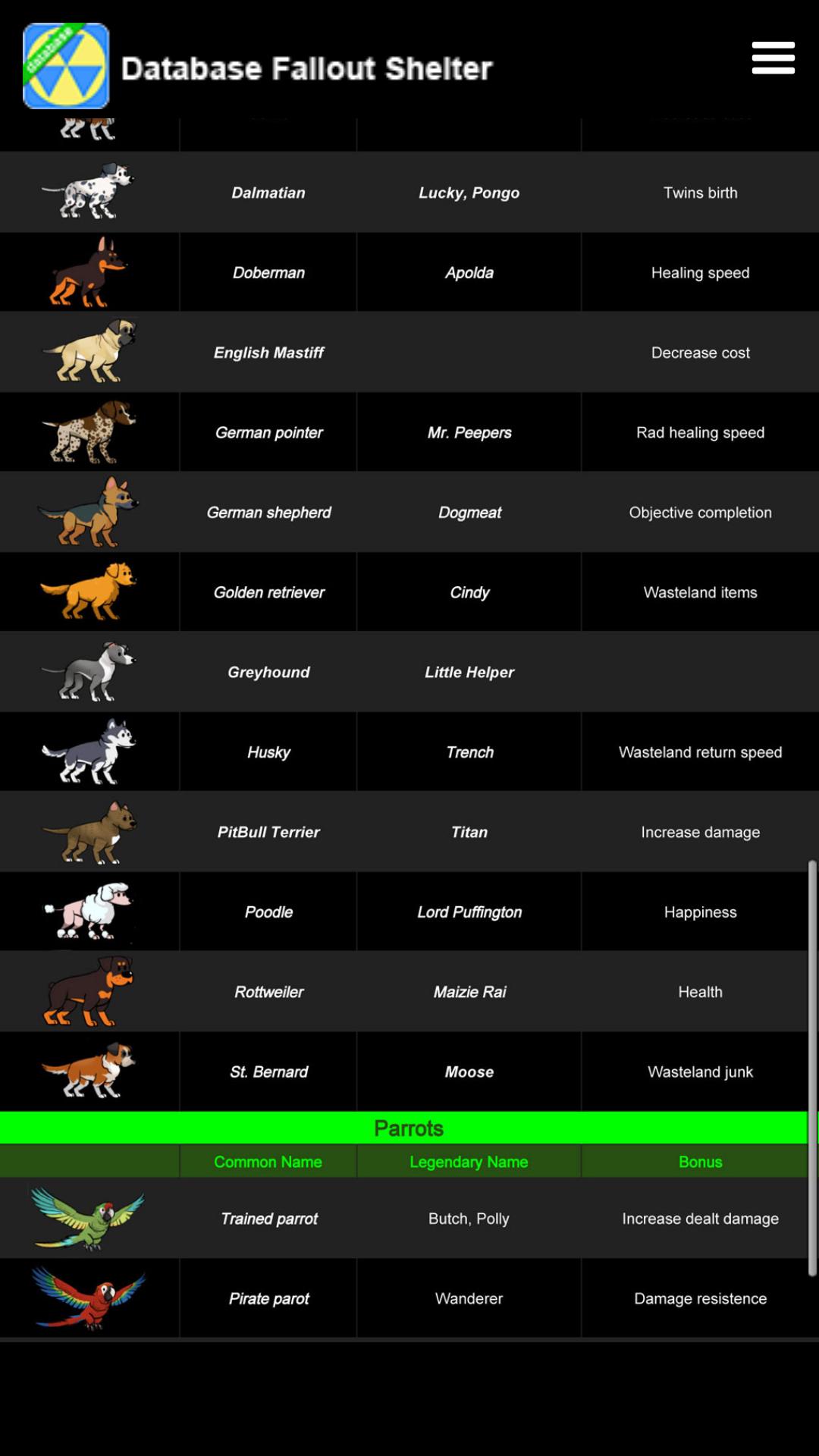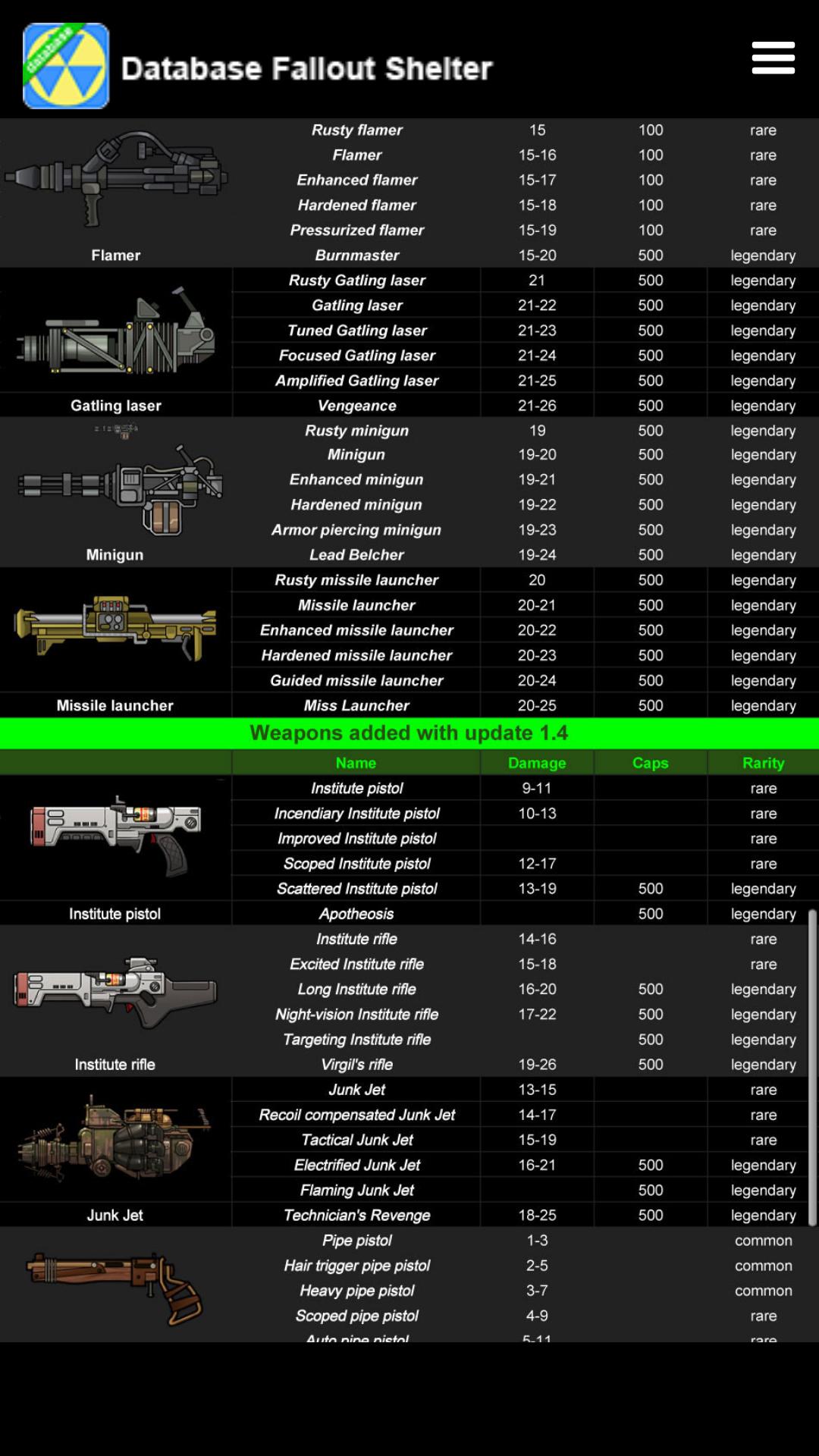 Database Fallout Shelter ini memberikan informasi dasar tentang pencarian dalam game, tujuan, penghuni, pakaian, senjata, barang-barang sampah, hewan peliharaan dan makhluk.
