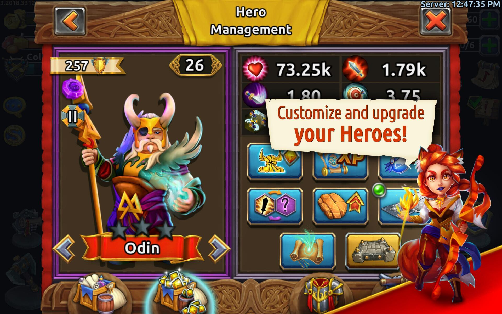 Kumpulkan pahlawan yang kuat dalam permainan fantasi Viking ini dan muncul sebagai pemenang dari setiap pertempuran. Latih mereka sehingga mereka dapat memimpin pasukan prajurit Anda menuju kemenangan! Elemen RPG memungkinkan Anda untuk mengembangkan pahlawan Anda dengan berbagai cara!
