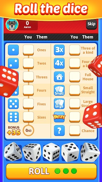 ?- Yatzy Blitz adalah game multipemain yang terdiri dari 13 putaran. Di setiap putaran, Anda dapat menggulung 5 dadu hingga 3 kali.