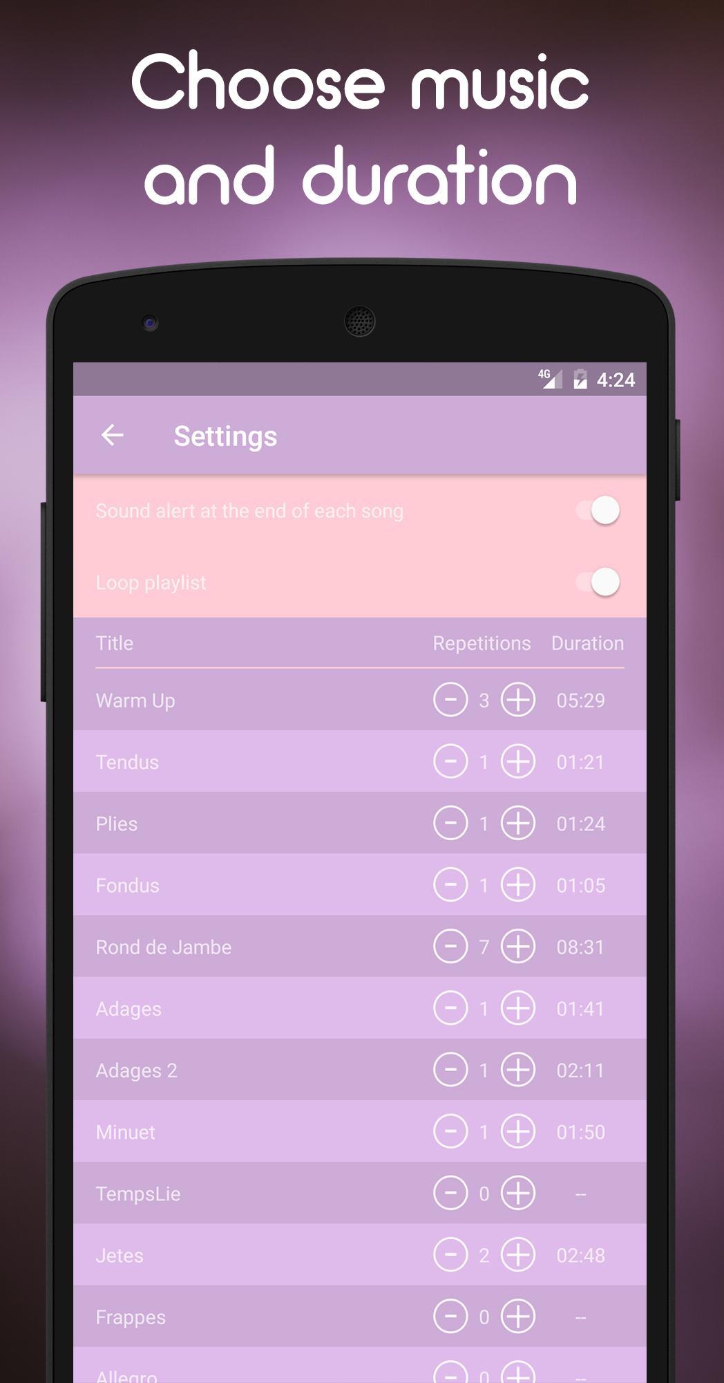 Ballet Classは非常にユーザーフレンドリーで、ミニマリストで直感的なインターフェイスがあります。チューンリストにアクセスし、各曲がどのくらい再生されるかを選択してから、ルーチンを続行します!デバイスにBallet Classがあることは、プロの学校のピアニストが自宅で最高のバレエ音楽を演奏させるようなものです。