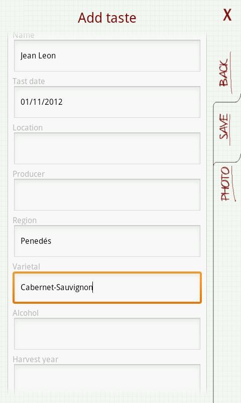 本物のテイスティングシートとフォローメニューに基づいて、どこにいても飲んでいるワインのシンプルで非常に関連性の高いテイスティングを実行するためのアプリを作成しました。また、アプリ自体がボトルまたはそのラベルのテイスティングに添付された写真を撮ることができます。