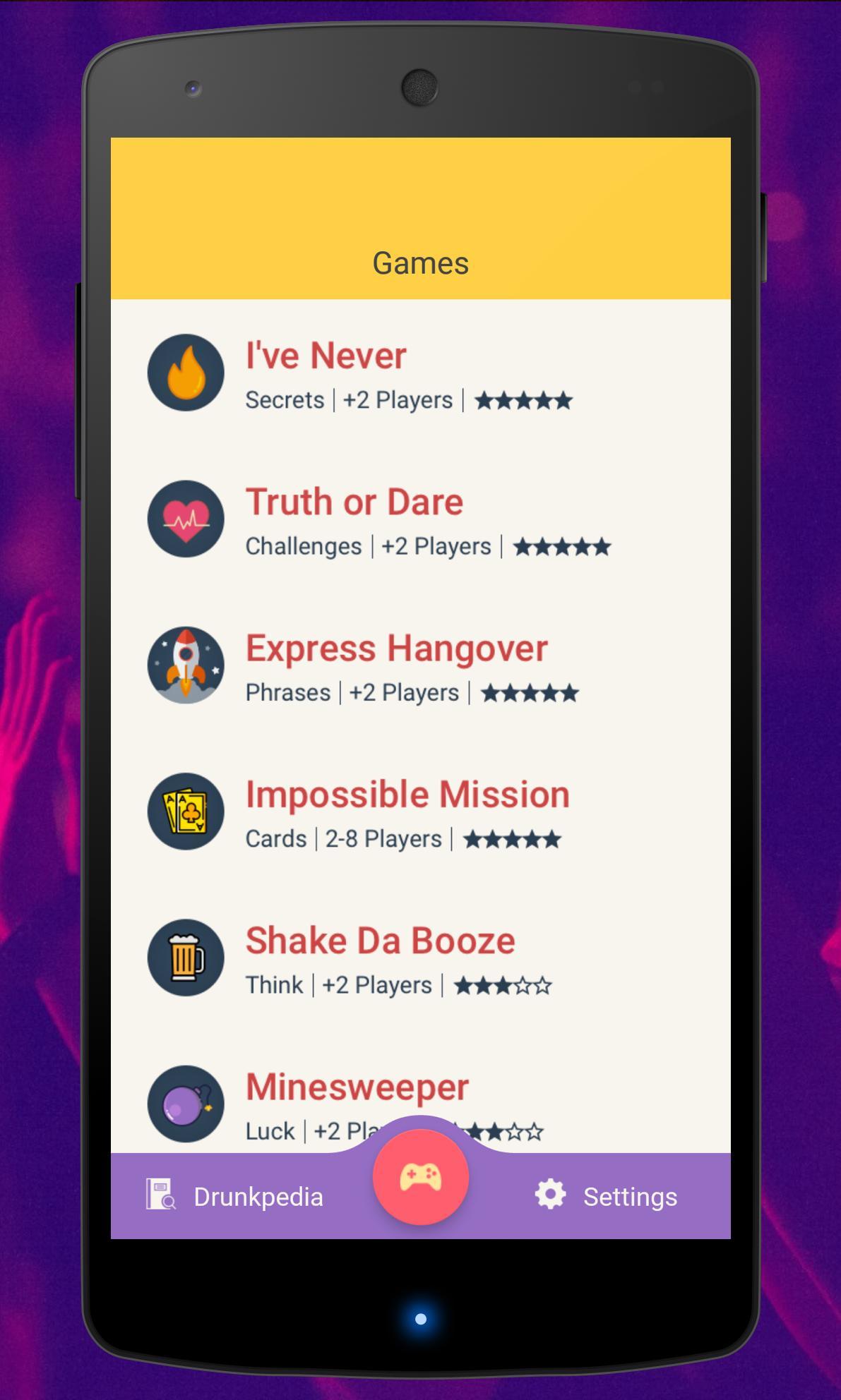 お使いの携帯電話でたくさんの飲酒ゲームを楽しんでください。いつも一緒に持っていて、パーティーに連れて行くことができます。パーティーマンのスイスナイフを手に入れましょう!ダイス、カード、その他多くのタイプのゲームを見つけることができ、最大8人の友人と遊ぶことができます!そして、Drunkpediaのセクションでは、世界中の多数の飲酒ゲームのルールを知ることができます。
