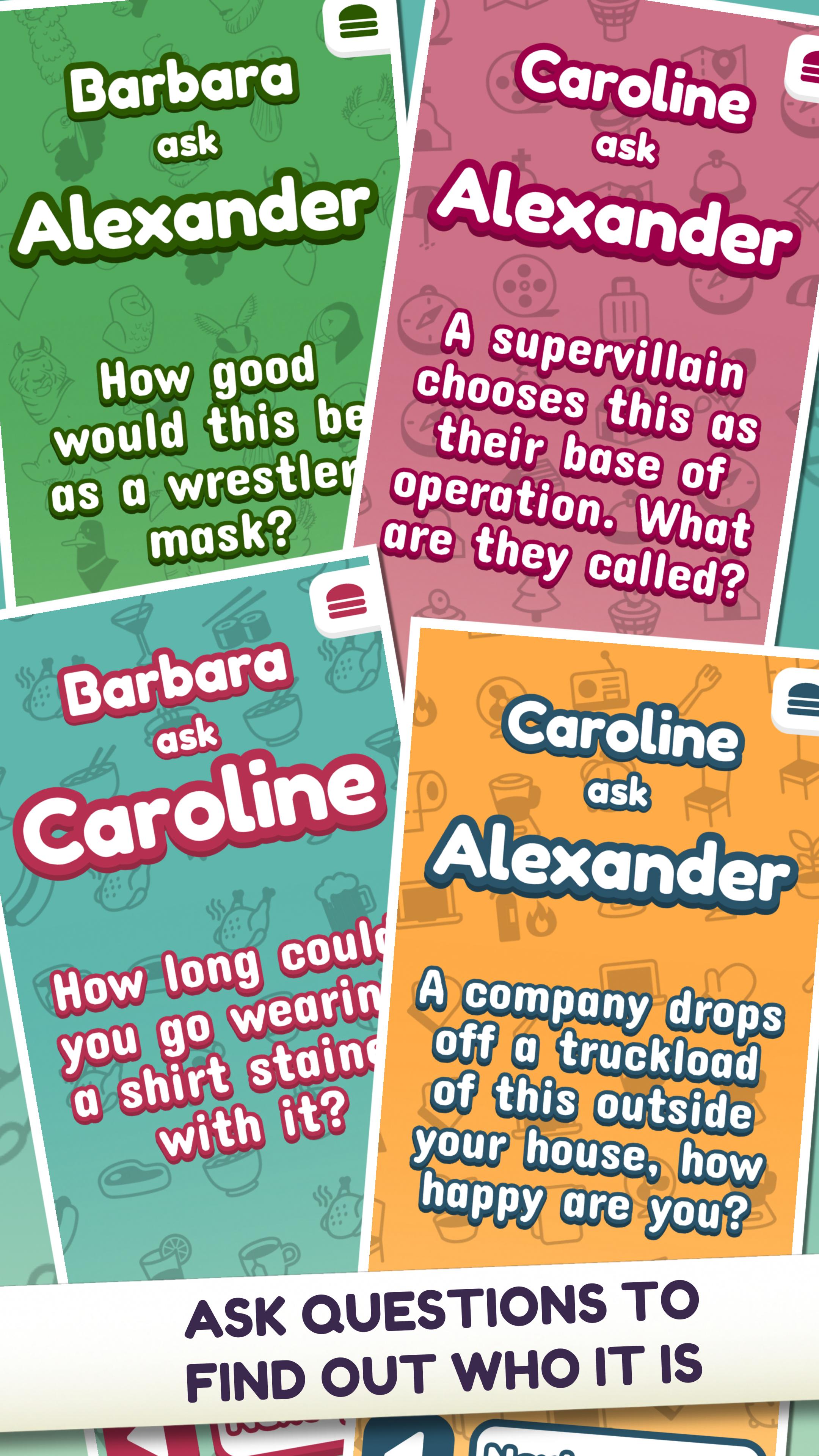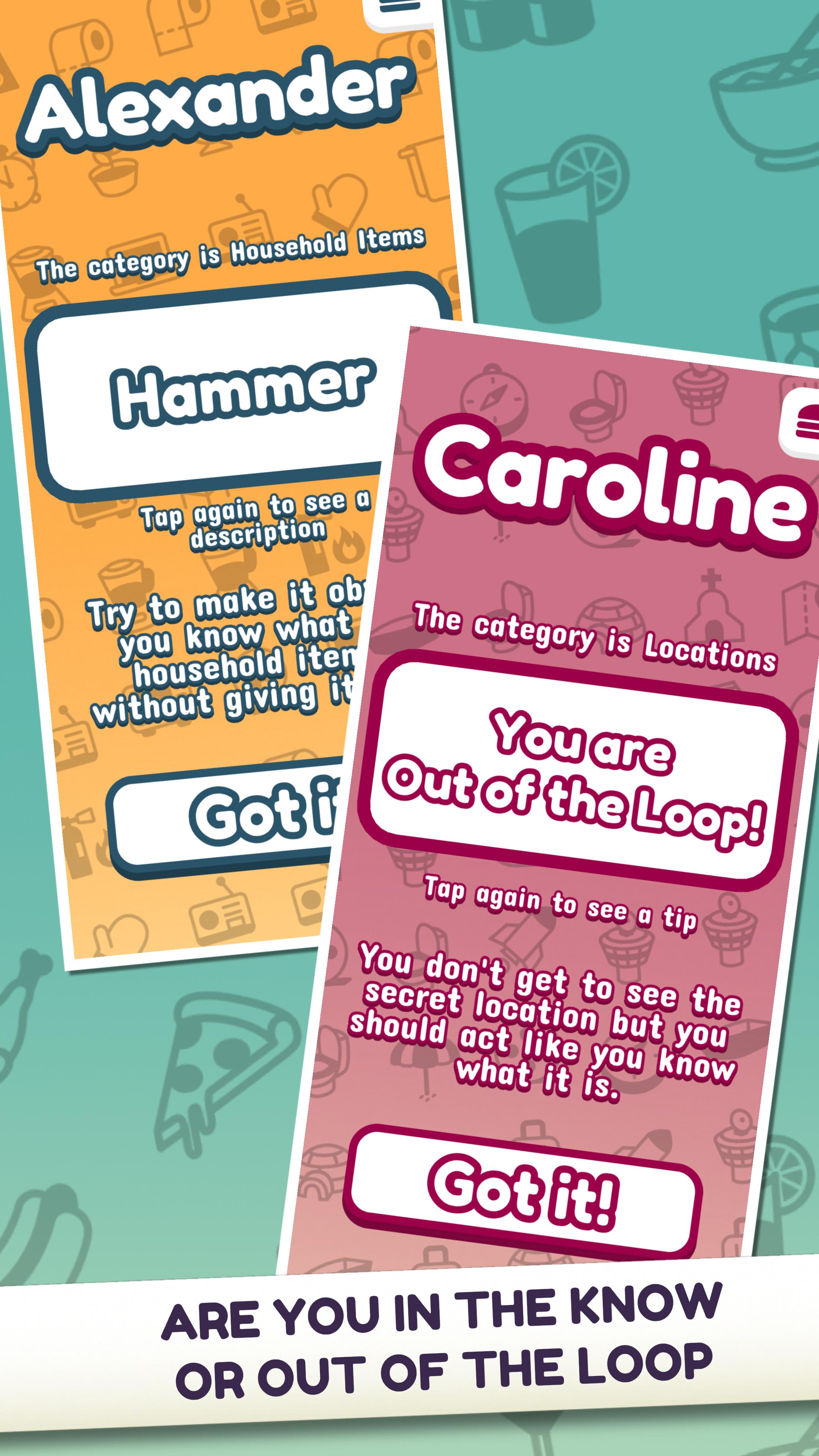 ラウンドのカテゴリを選択した後、各プレイヤーはカテゴリ内の秘密の単語を知るか、 Out of the Loopことを知ることができます。その後、各プレイヤーはOut of the Loopと思う人に投票する前に、単語に関する単一の質問に答えます。誰かが疑わしい答えを持っていましたか?彼らはドーナツがいっぱいのドーナツの考えを笑わなかったのですか?彼らに投票してください!