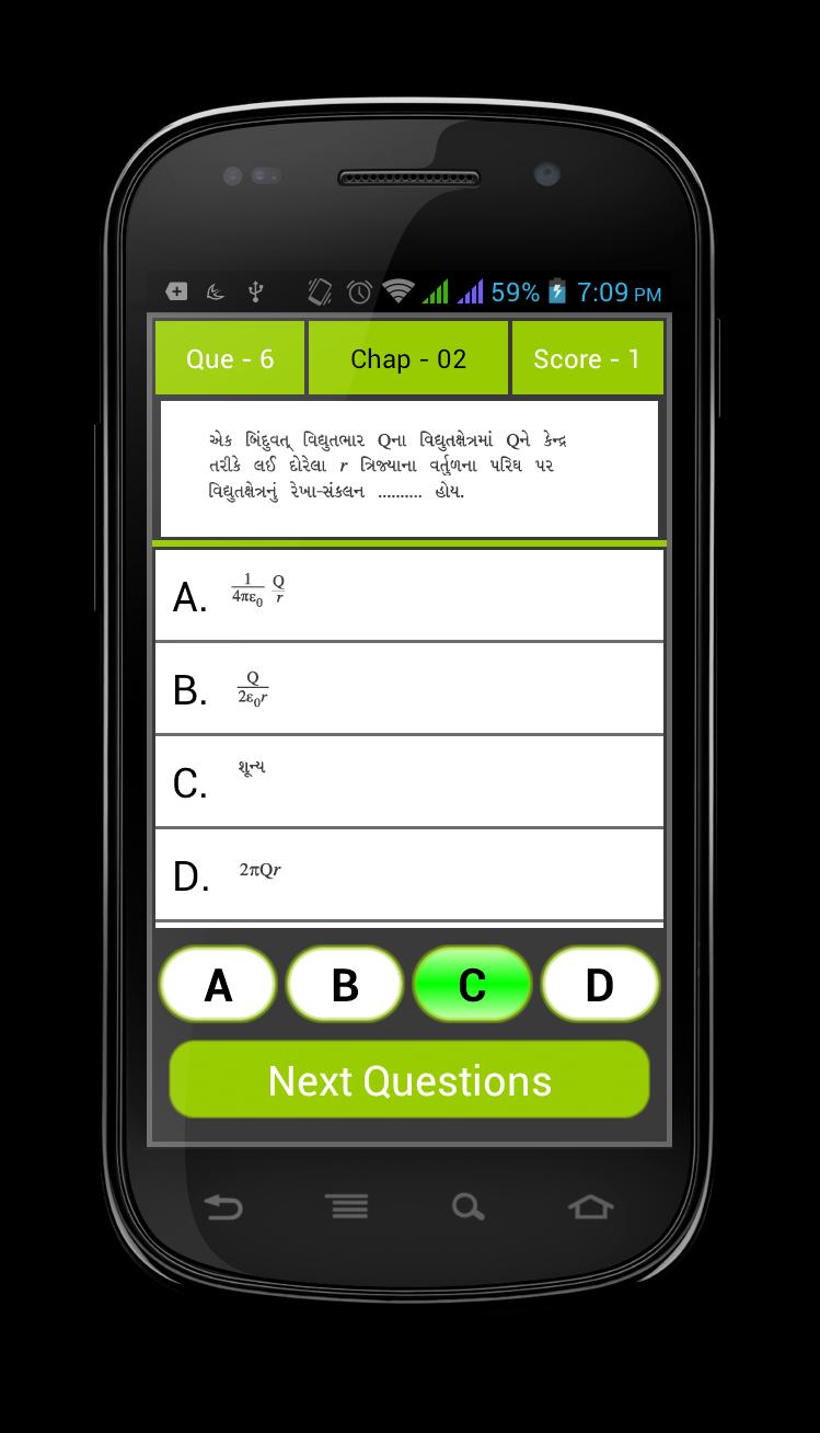 퀴즈에는 GSEB의 강의 계획서에 따라 질문이 포함되어 있습니다. 다른 색상은 정답을 식별하는 데 사용됩니다. 빨간색, 녹색, 노란색, 회색 등과 같은 다른 색상의 제안 된 답변 및 잘못된 답변.