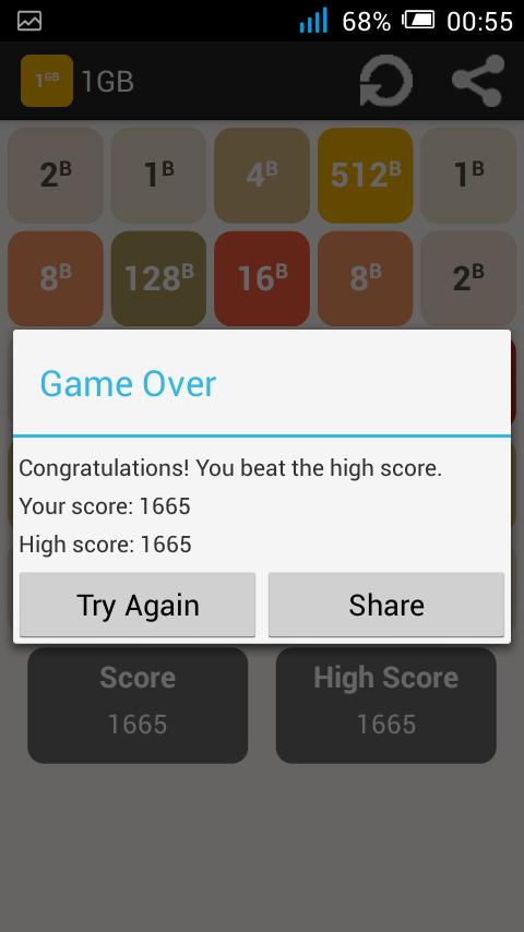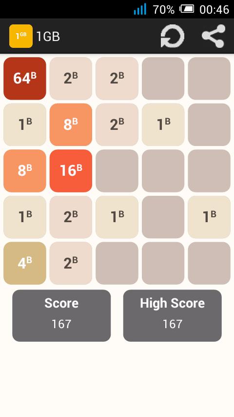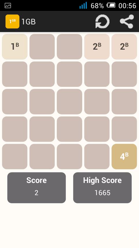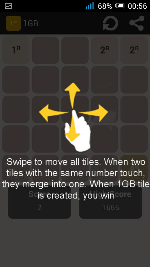 1B (1 바이트)에서 시작하여 타일을 움직이기 위해 스 와이프 (위, 아래, 왼쪽, 오른쪽)를 스 와이프합니다. 같은 숫자가있는 두 개의 타일이 터치하면 하나로 합쳐집니다. 1GB 타일이 만들어지면 승리합니다!