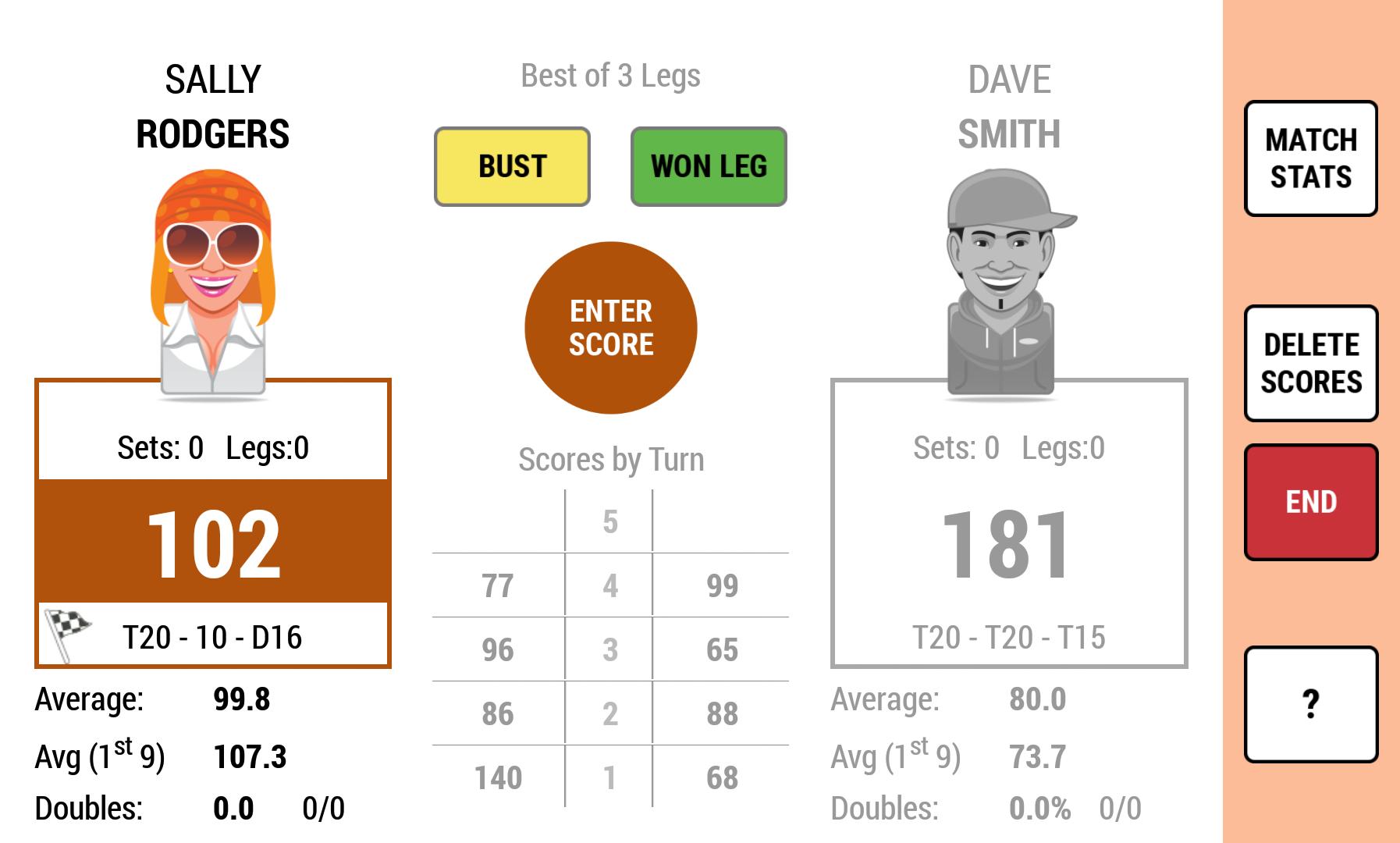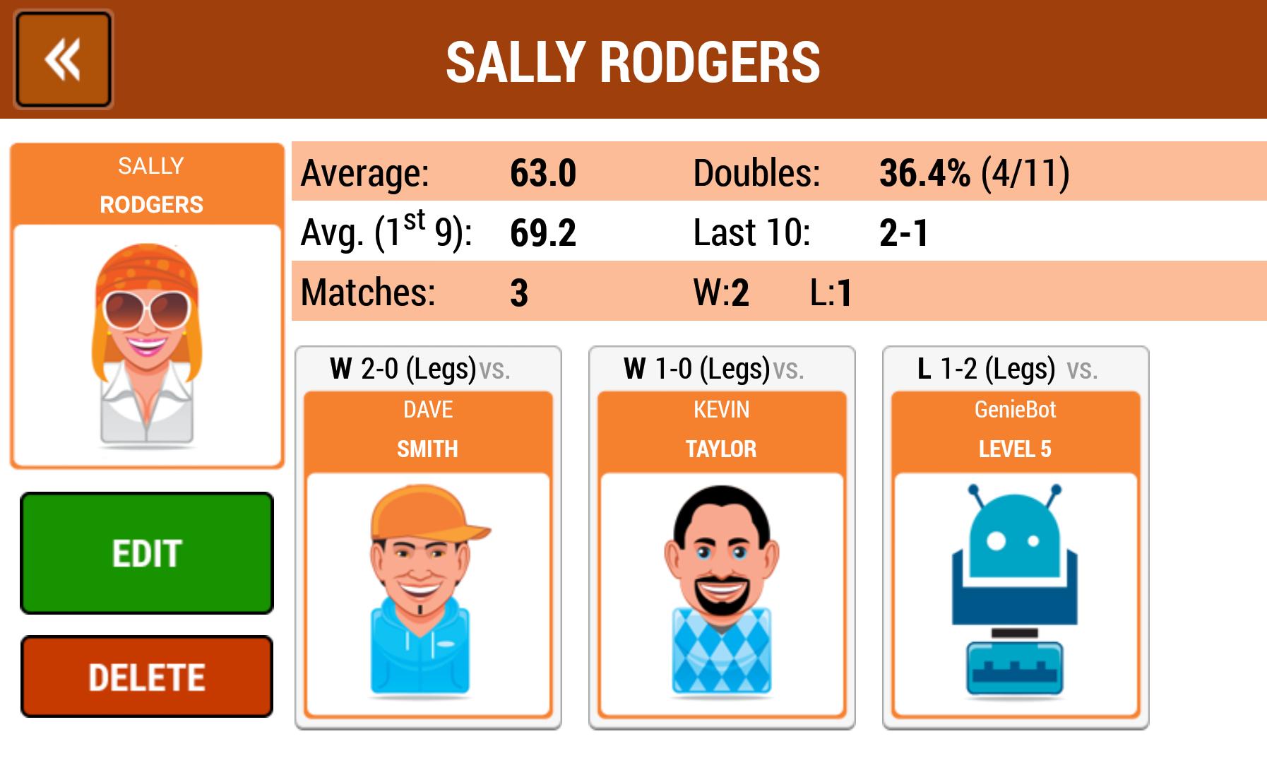 - 모든 경기에 대한 자세한 통계 및 스코어 카드 : 평균, 첫 9 평균, 최고 레그, 복식 %, 점수 테이블 (60 대, 100 대, 140 및 180 년대 등) 등
