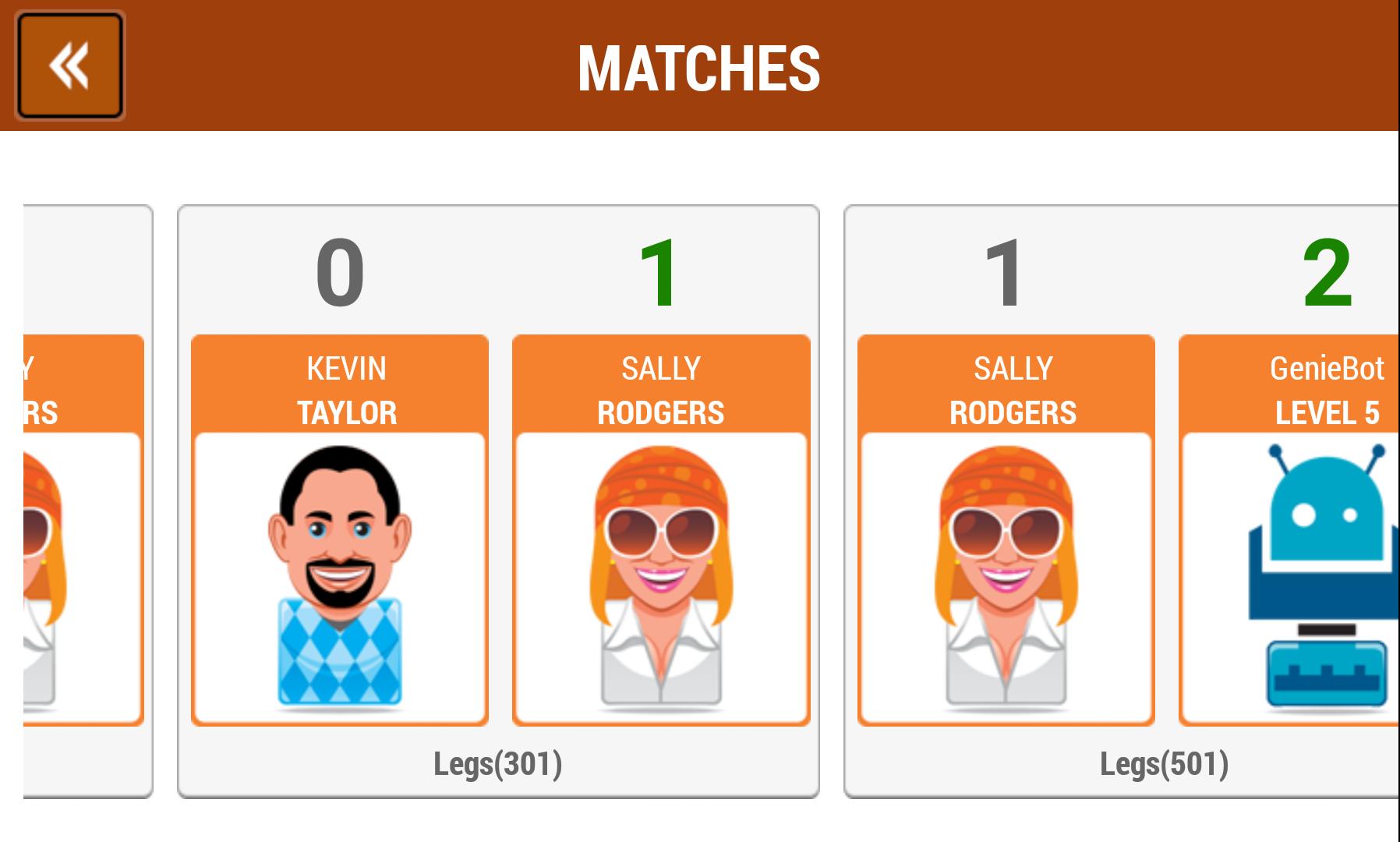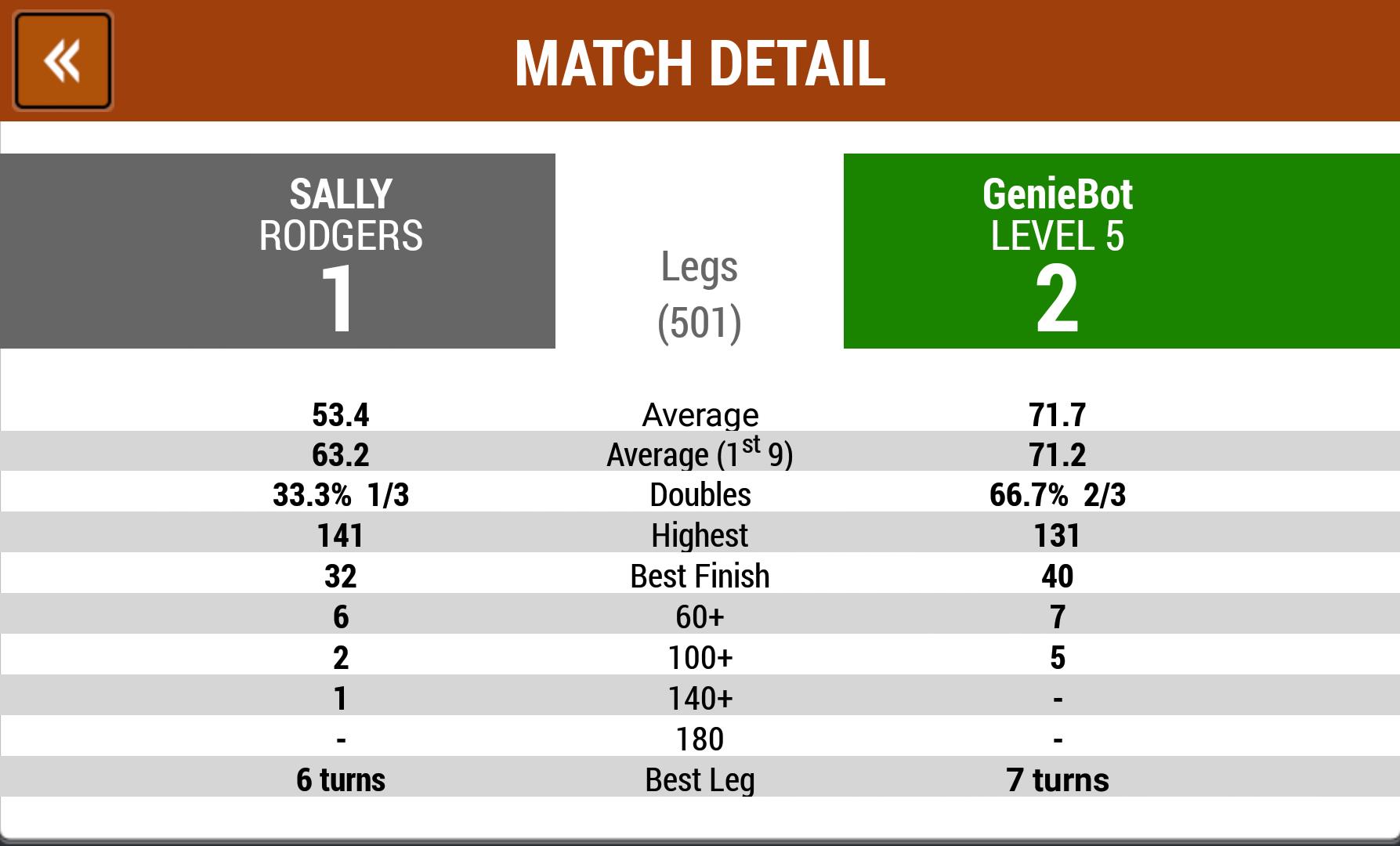-Darts vs. Geniebot (10 레벨의 다트 플레이 봇). 강력한 AI (인공 지능)는 Geniebot이 매우 인간과 같은 것을 의미합니다