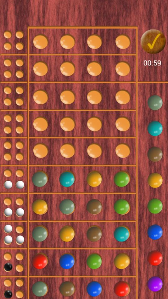 이 게임은 8 가지 색상과 2 레벨을 제공합니다. 쉬운, 비밀 코드에서 중복 색상을 허용하지 않거나 중복 색상을 허용하는 하드 모드를 허용합니다.