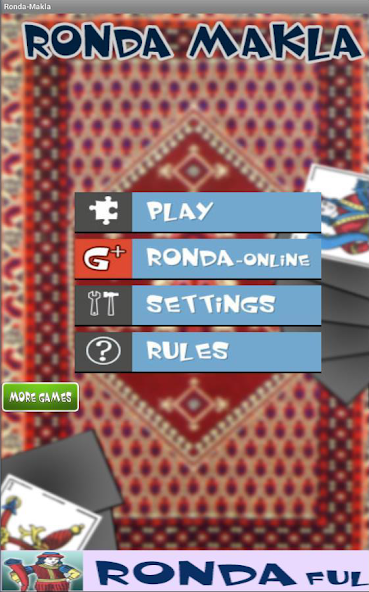 Ronda Makla (Carta)는 원래 Ronda (https://play.google.com/store/apps/details?id=com.bendev.ronda.game.Activity)와 너무 비슷합니다. 차이점은 규칙이 없으며, 목표는 손에서 카드를 연주하여 테이블에서 카드를 캡처합니다.