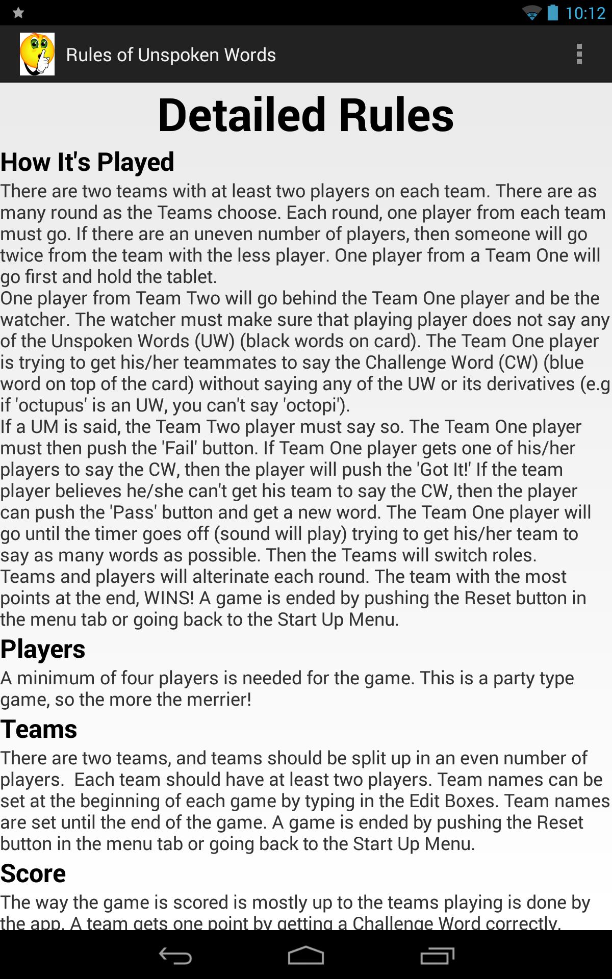 Unspoken Words는 금기 게임과 매우 유사하지만 휴대용 장치용입니다. 귀하의 기기를 위한 멀티플레이어(파티) 게임입니다. 팀 이름을 만들고, 턴당 시간 길이를 선택하고, 게임 채점 방식도 선택할 수 있습니다. 정말 재미 있고 가족 게임의 밤에 좋습니다. 카드 보유, 포인트 추가 또는 시간 유지에 대해 걱정할 필요가 없습니다!