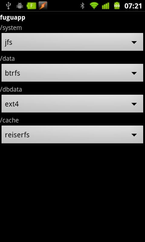Isso permite a configuração dos sistemas de arquivos no kernel FUGUMOD. A versão gratuita permite apenas escolher entre ext4 e jfs. Também não inclui utilitários adicionais, como o BLN Control