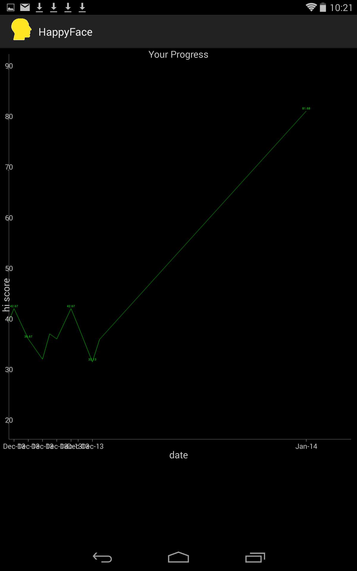 HappyFace permite monitorar seu progresso de duas maneiras. Selecionar 'Show Progress' exibe um gráfico da sua pontuação mais alta para cada dia em que você jogou o jogo. A seleção de 'Show Duration' mostrará um gráfico do número de minutos que você praticou todos os dias.